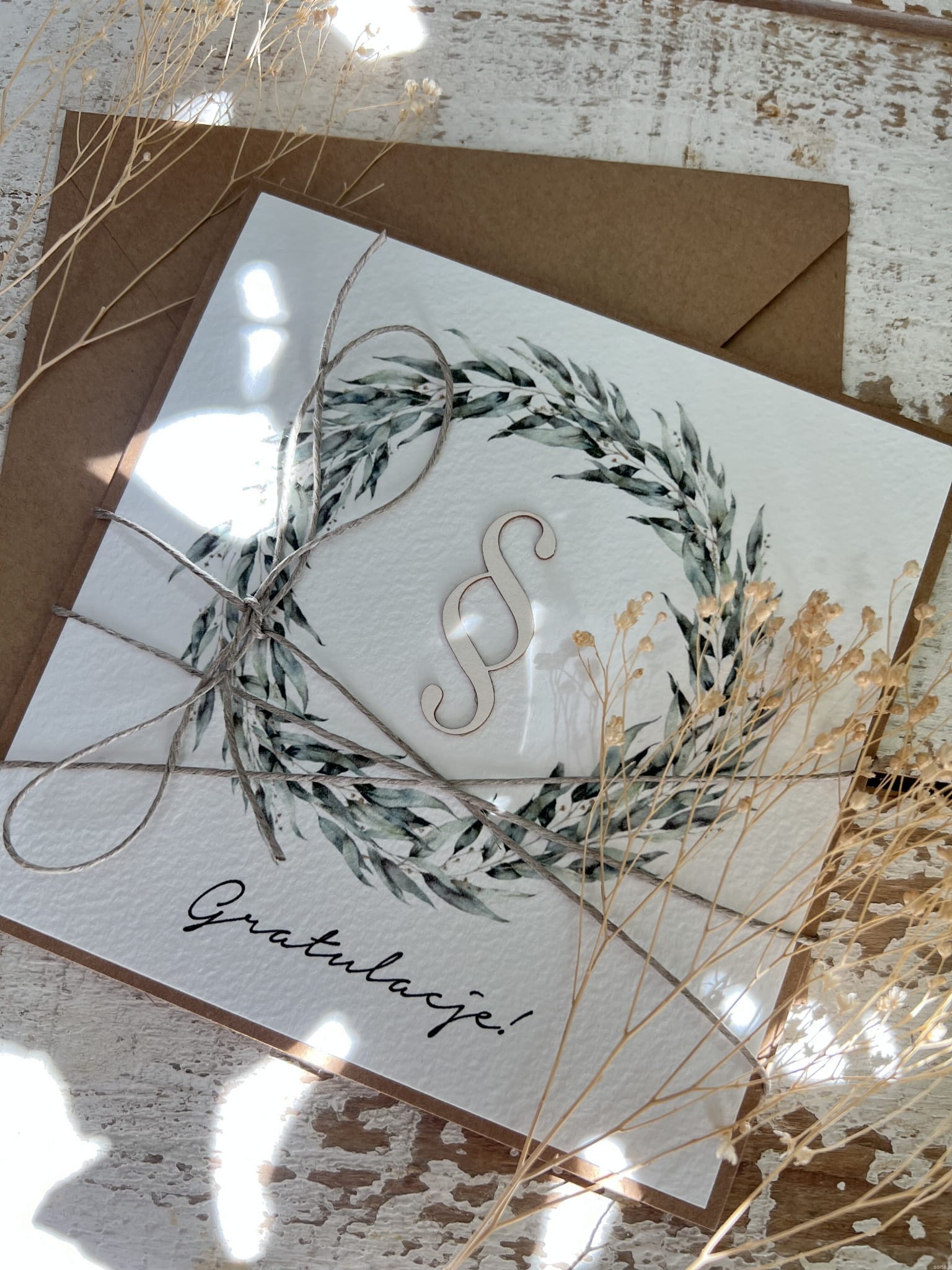 Kartka w środku pusta gotowa do wypisania życzeń odręcznie.
