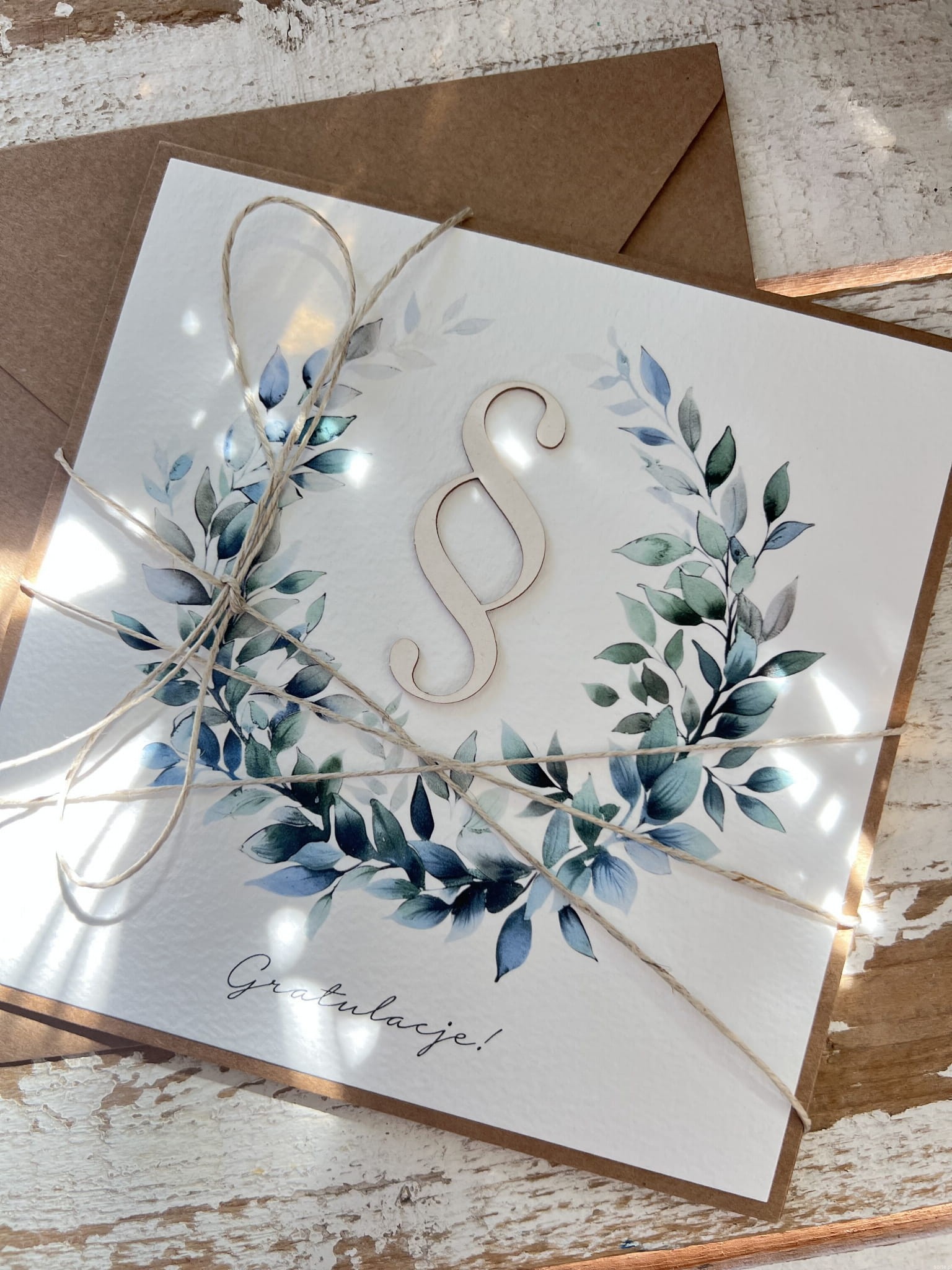 Kartka w środku pusta gotowa do wypisania życzeń odręcznie.