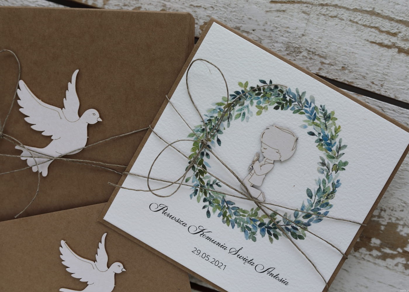 Rustykalna kartka na komunię handmade wykonana na bazie papieru kraftowego z użyciem starannie wyselekcjonowanego papieru bawełnianego w kolorze ecri oraz tekturkowej dziewczynki. Kartka otwierana jest do góry. Zestaw przewiązany jest lnianym sznureczkiem.
