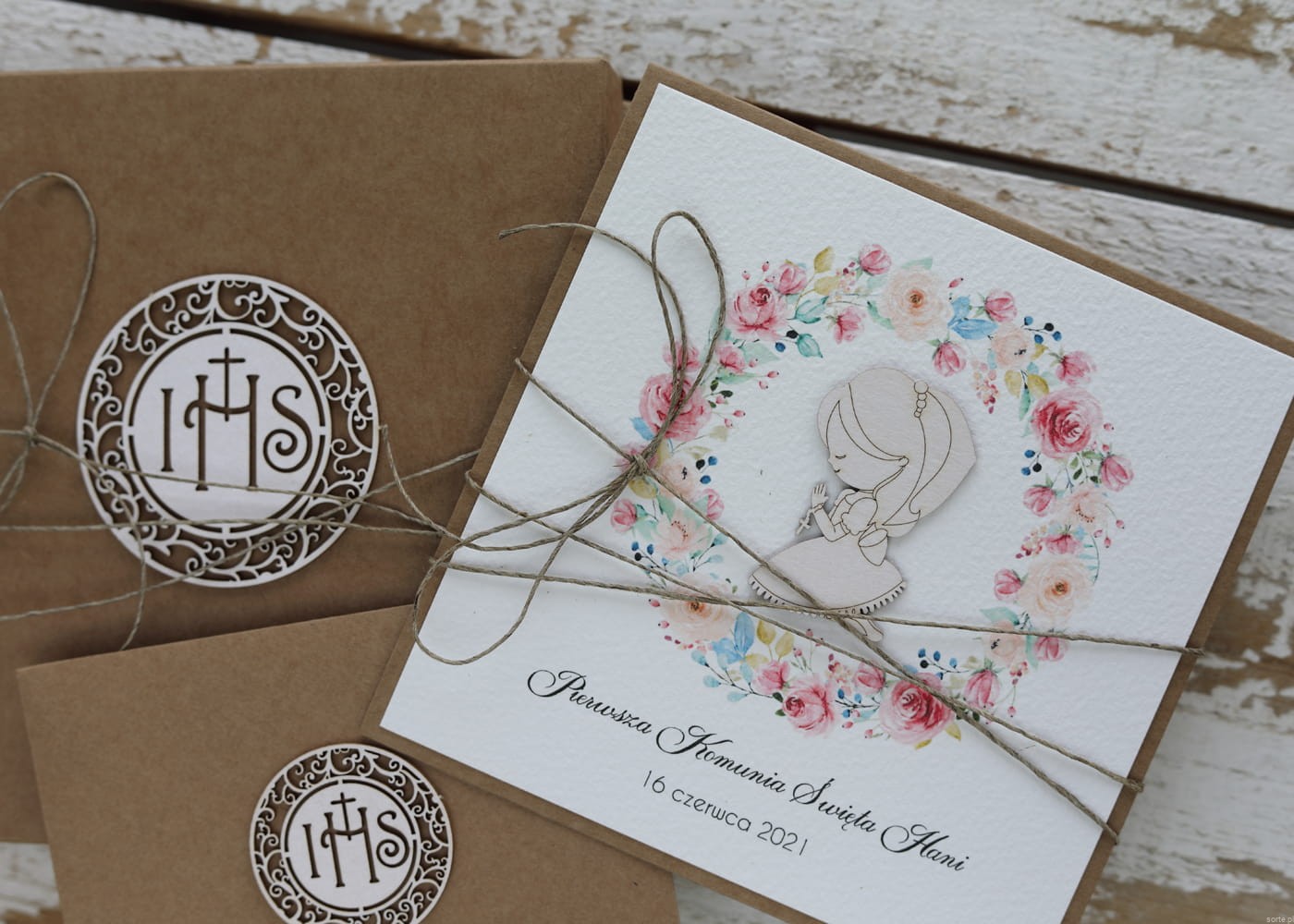 Rustykalna kartka na komunię handmade wykonana na bazie papieru kraftowego z użyciem starannie wyselekcjonowanego papieru bawełnianego w kolorze ecri oraz tekturkowej ozdoby. Kartka otwierana jest do góry. Zestaw przewiązany jest lnianym sznureczkiem.