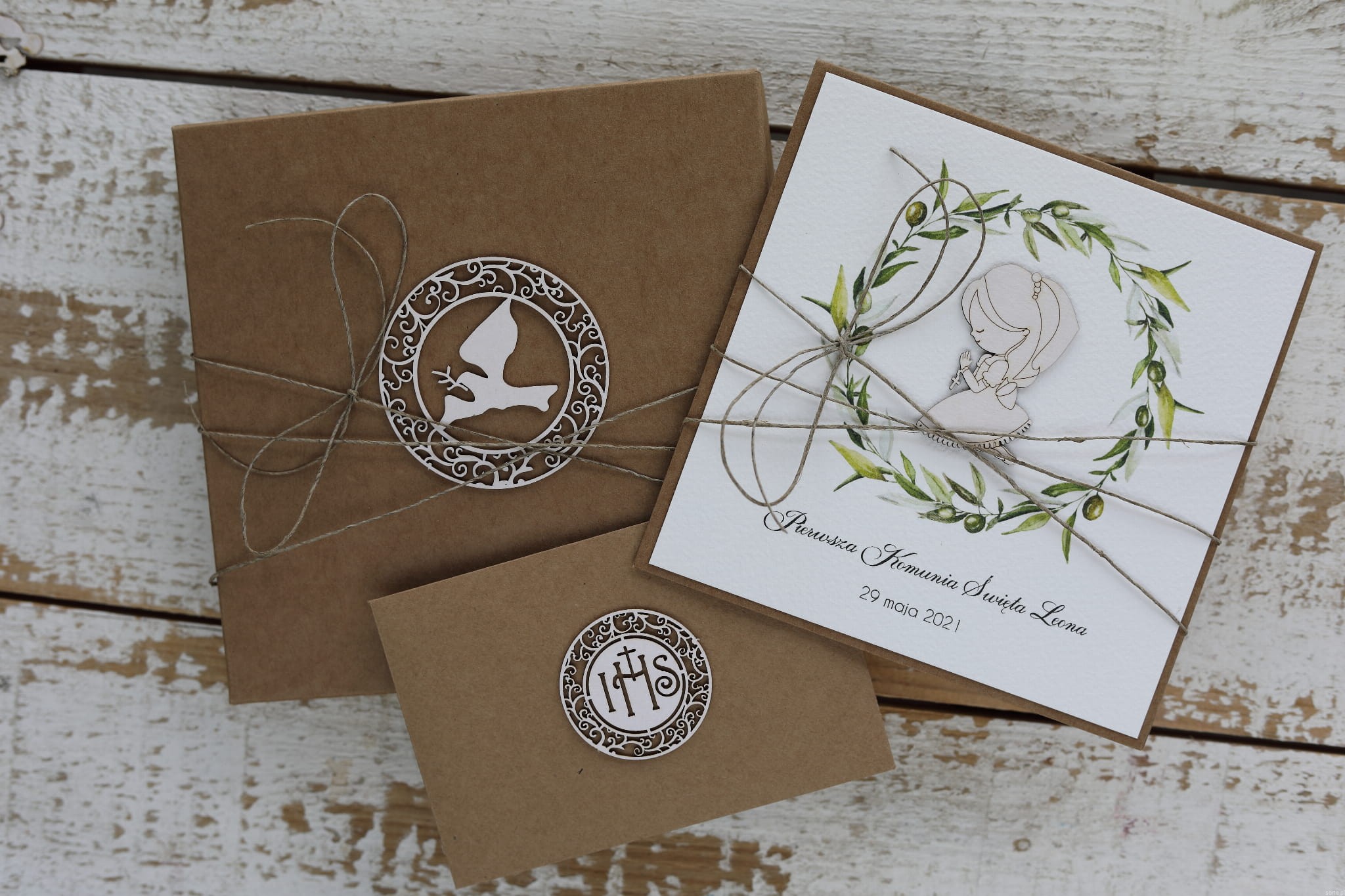 Ręcznie robiona kartka komunijna od ojca chrzestnego, matki chrzestnej - wianek oliwkowy