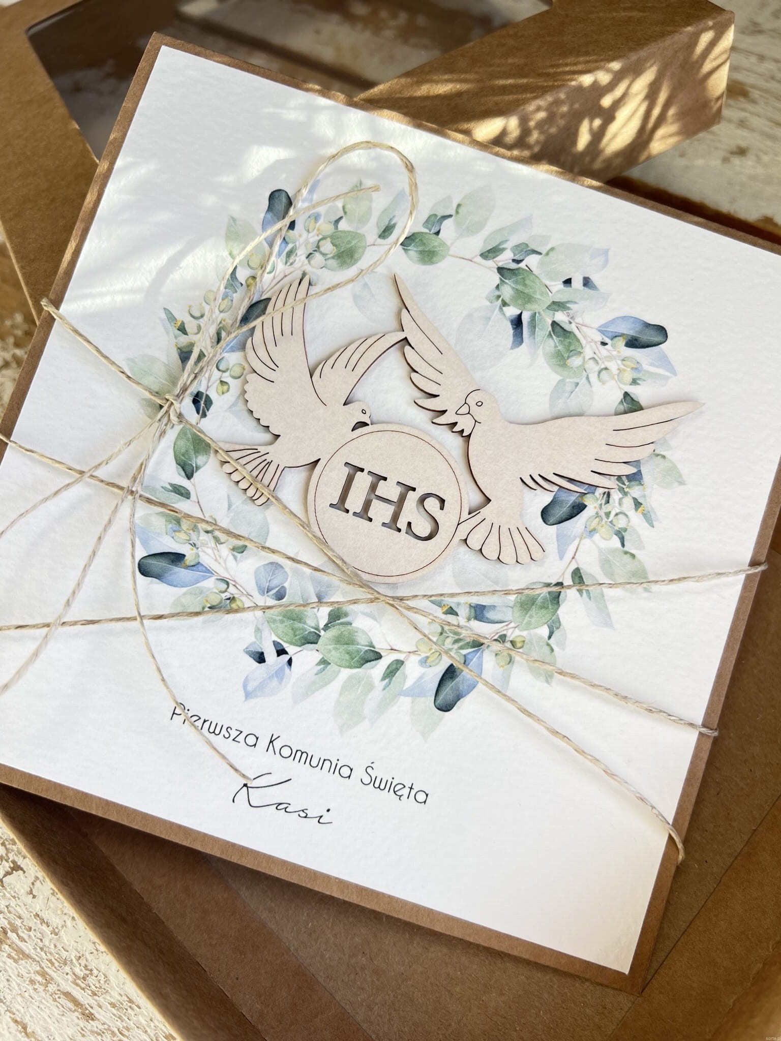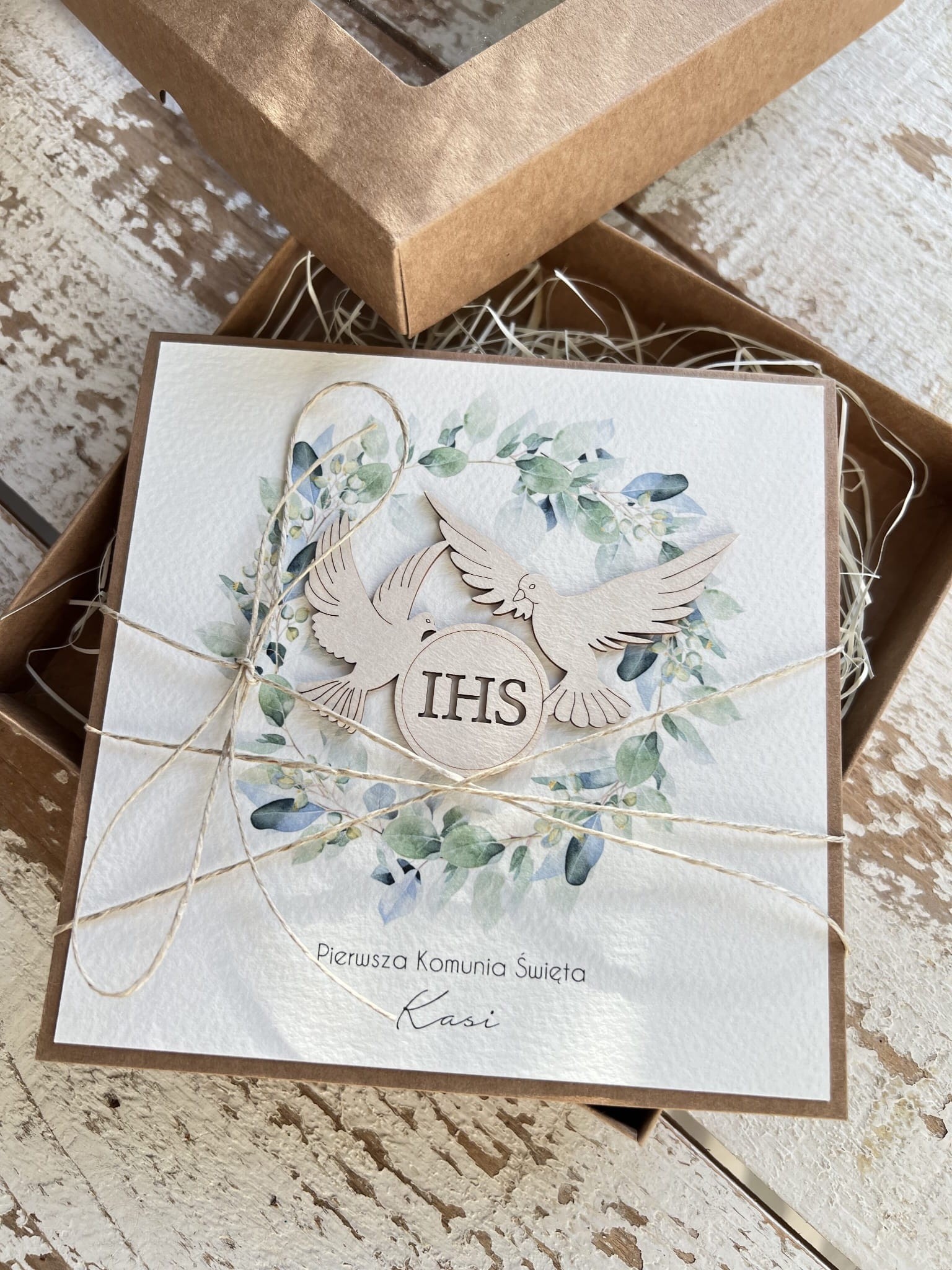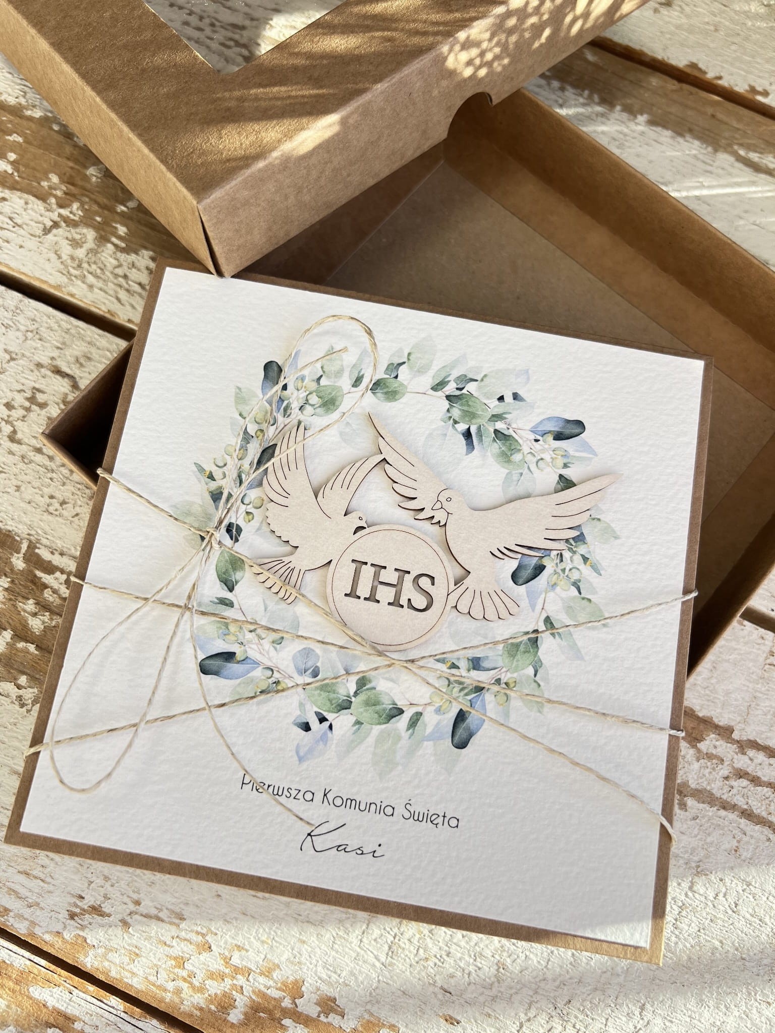 Ręcznie robiona kartka komunijna z personalizacją w wianku od ojca chrzestnego, matki chrzestnej - prezent na komunię dla chrześniaka, życzenia komunijne