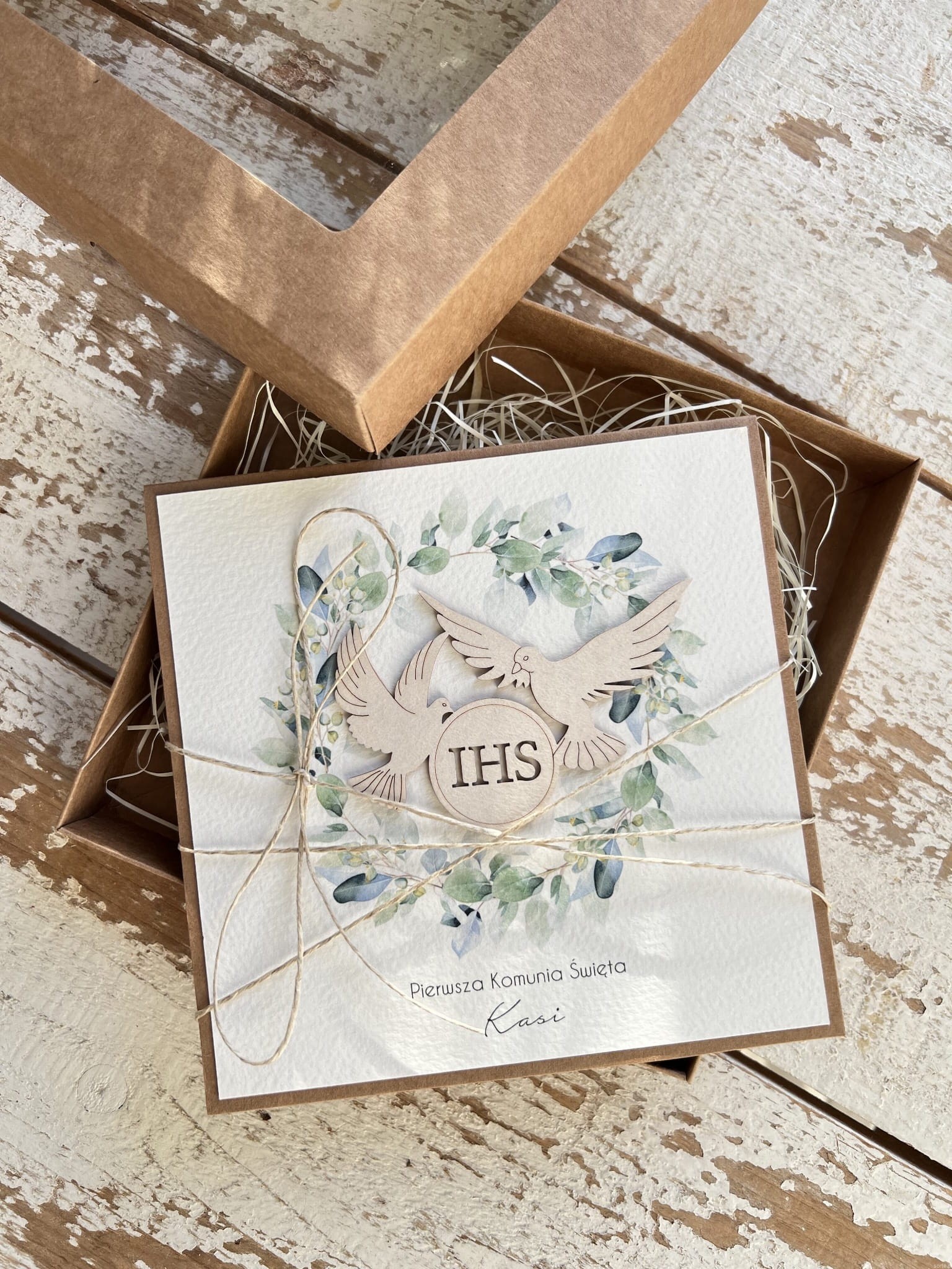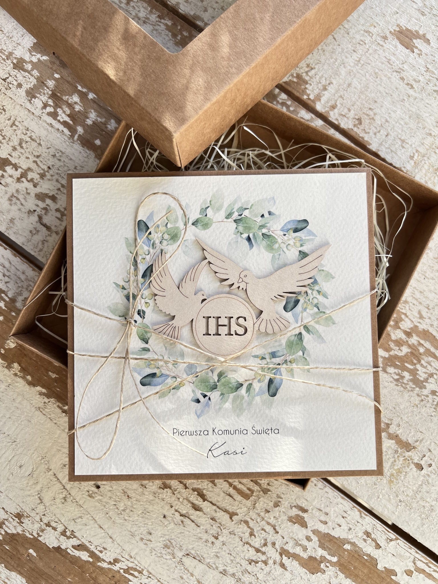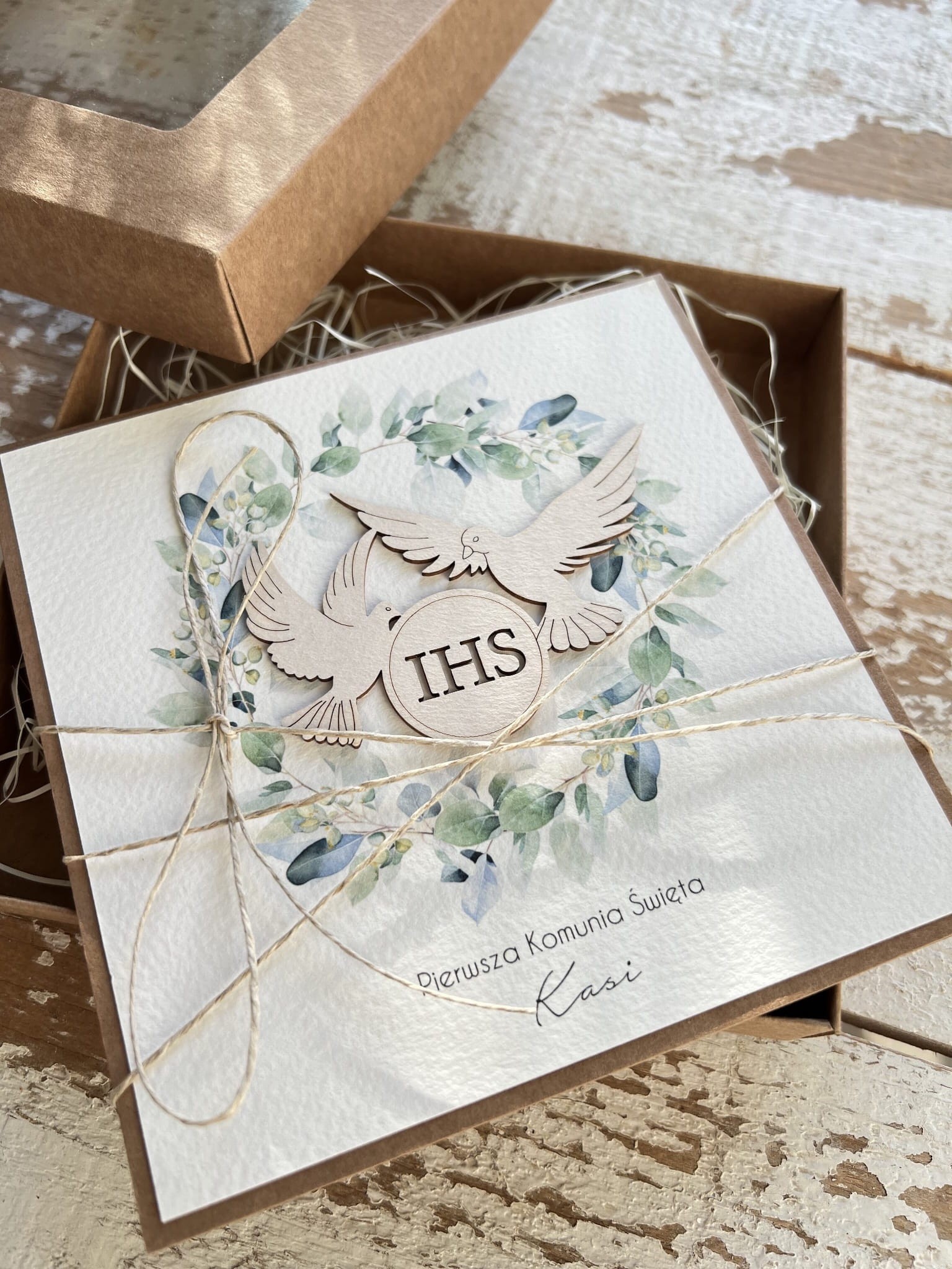 Ręcznie robiona kartka komunijna z personalizacją w wianku od ojca chrzestnego, matki chrzestnej - prezent na komunię dla chrześniaka, życzenia komunijne