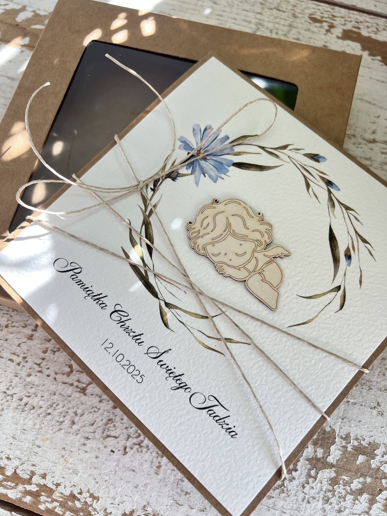 Rustykalna kartka na chrzest dla chłopca handmade wykonana na bazie papieru kraftowego z użyciem starannie wyselekcjonowanego papieru bawełnianego w kolorze ecri oraz tekturkowej ozdoby. Kartka otwierana jest do góry. Zestaw przewiązany jest lnianym sznureczkiem.