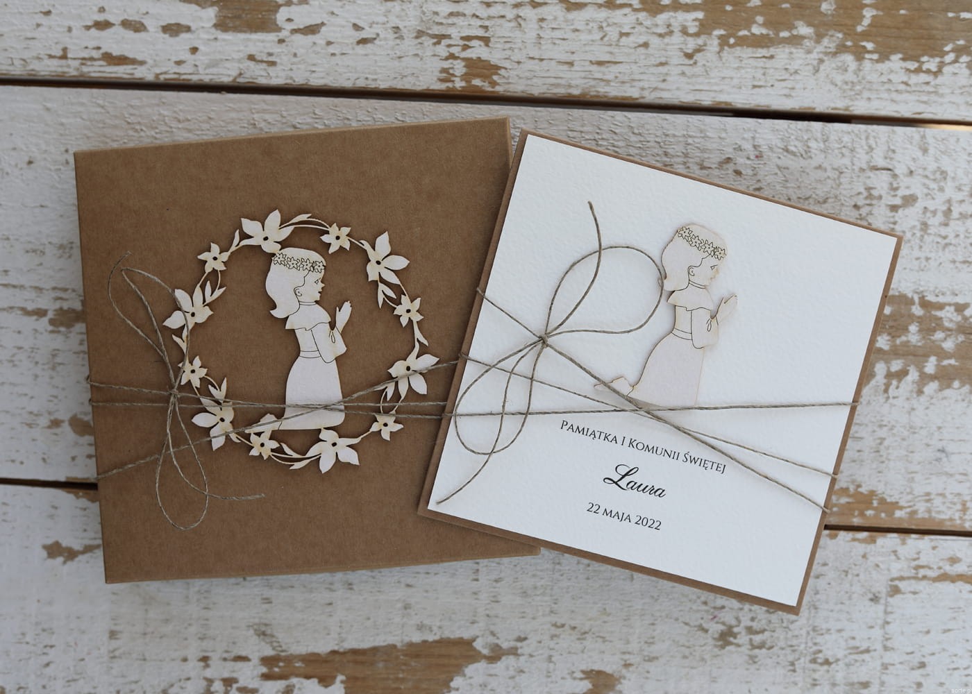 Rustykalna kartka na komunię handmade wykonana na bazie papieru kraftowego z użyciem starannie wyselekcjonowanego papieru bawełnianego w kolorze ecri oraz ozdoby tekturkowej. Zestaw przewiązany jest lnianym sznureczkiem.