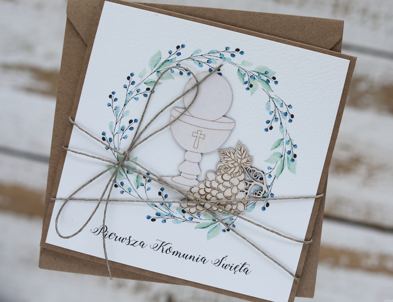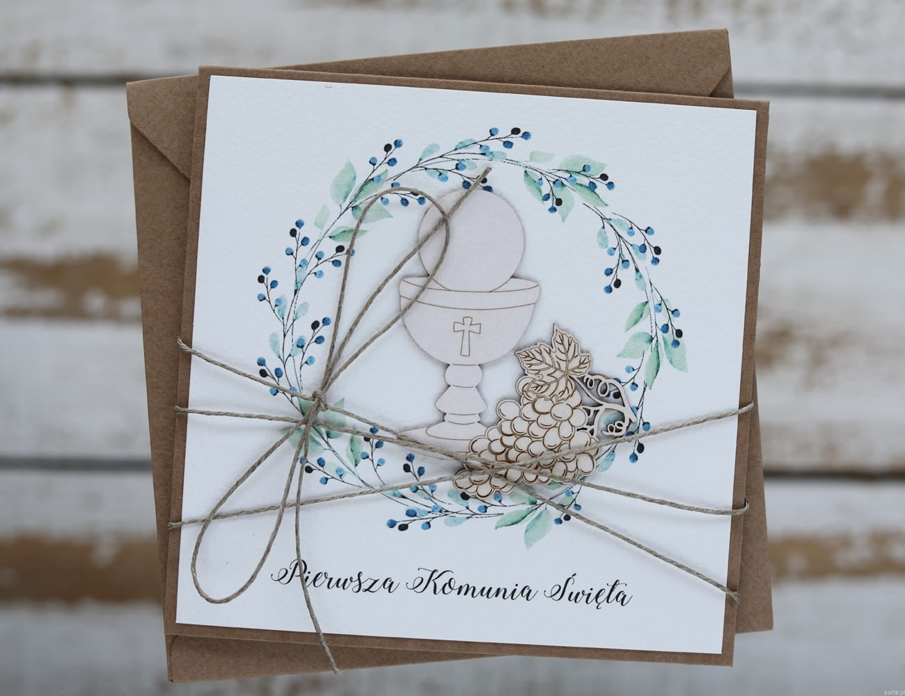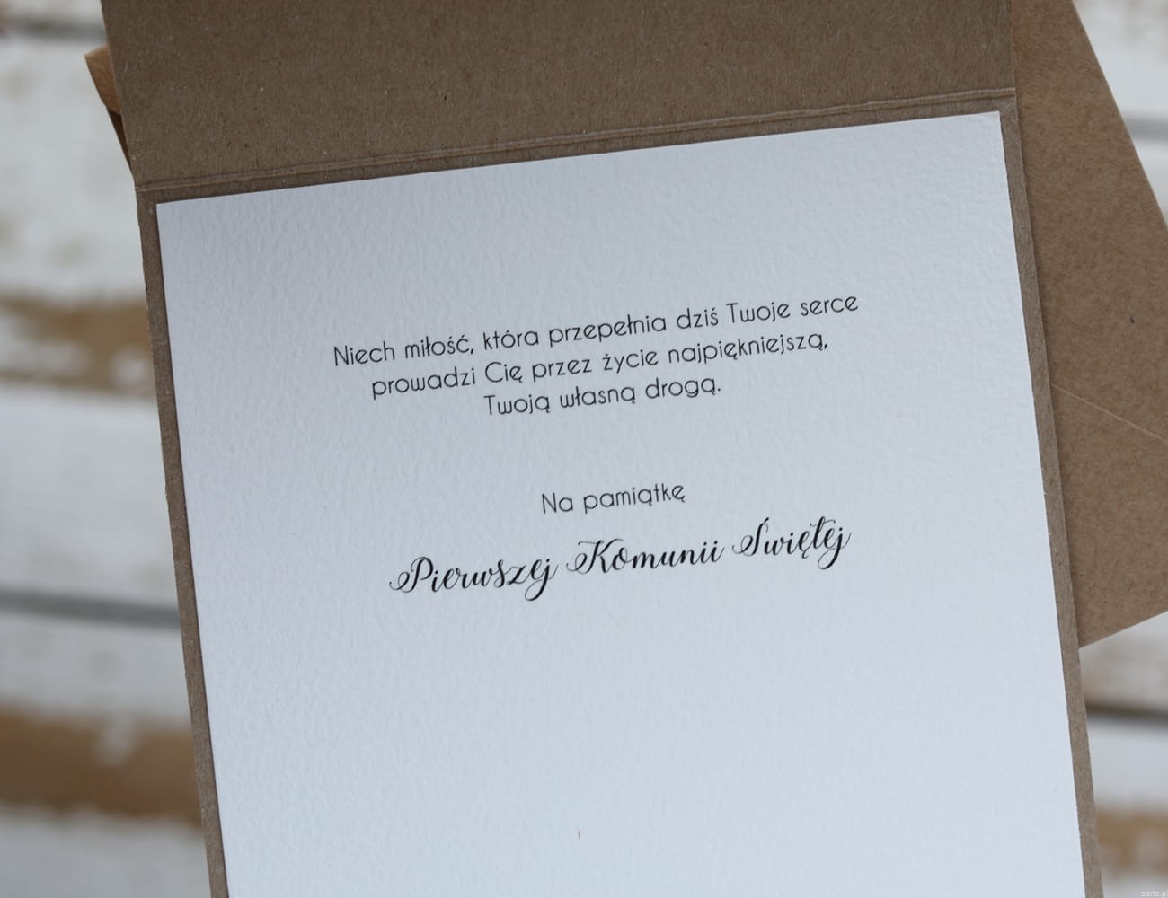 Kartka na komunię dla chłopca - pamiątka komunii o wymiarach 14x14 cm wykonana jest z papieru kraftowego oraz papieru bawełnianego w odcieniu śmietanki z użyciem ozdoby tekturkowej. Kartka otwierana do góry, w środku wklejona jest kartka z papieru bawełnianego z gotowymi życzeniami (brak możliwości zmiany). W zestawie z kopertą.