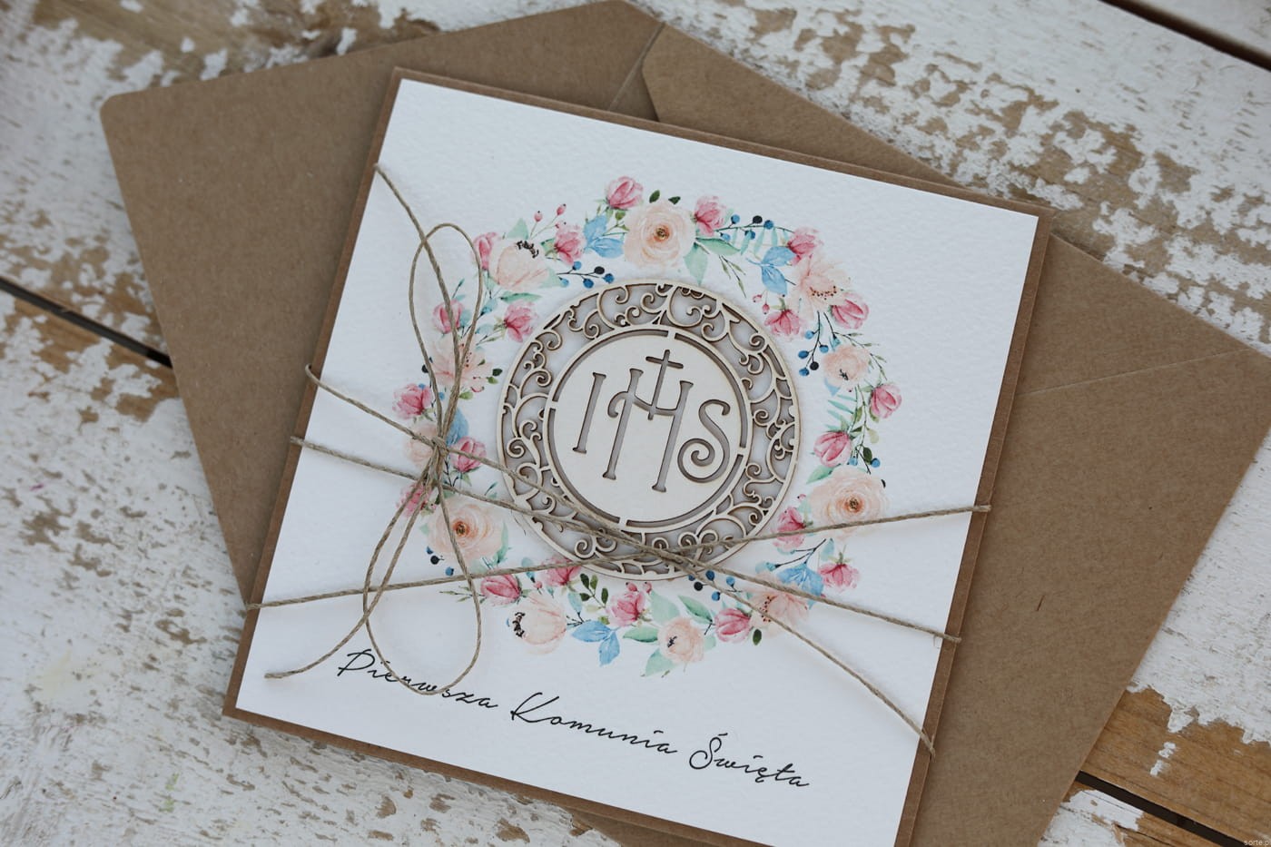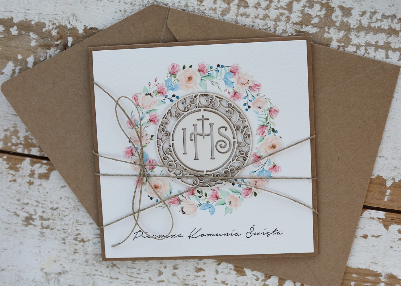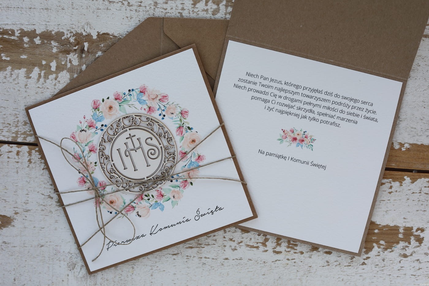 Kartka o wymiarach 14x14 cm wykonana jest z papieru kraftowego oraz papieru bawełnianego w odcieniu śmietanki z użyciem ozdoby tekturkowej. Kartka otwierana do góry, w środku wklejona jest kartka z papieru bawełnianego z gotowymi życzeniami (brak możliwości zmiany). W zestawie z kopertą.