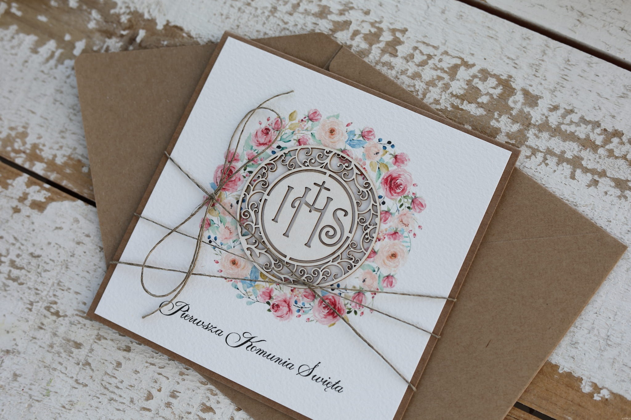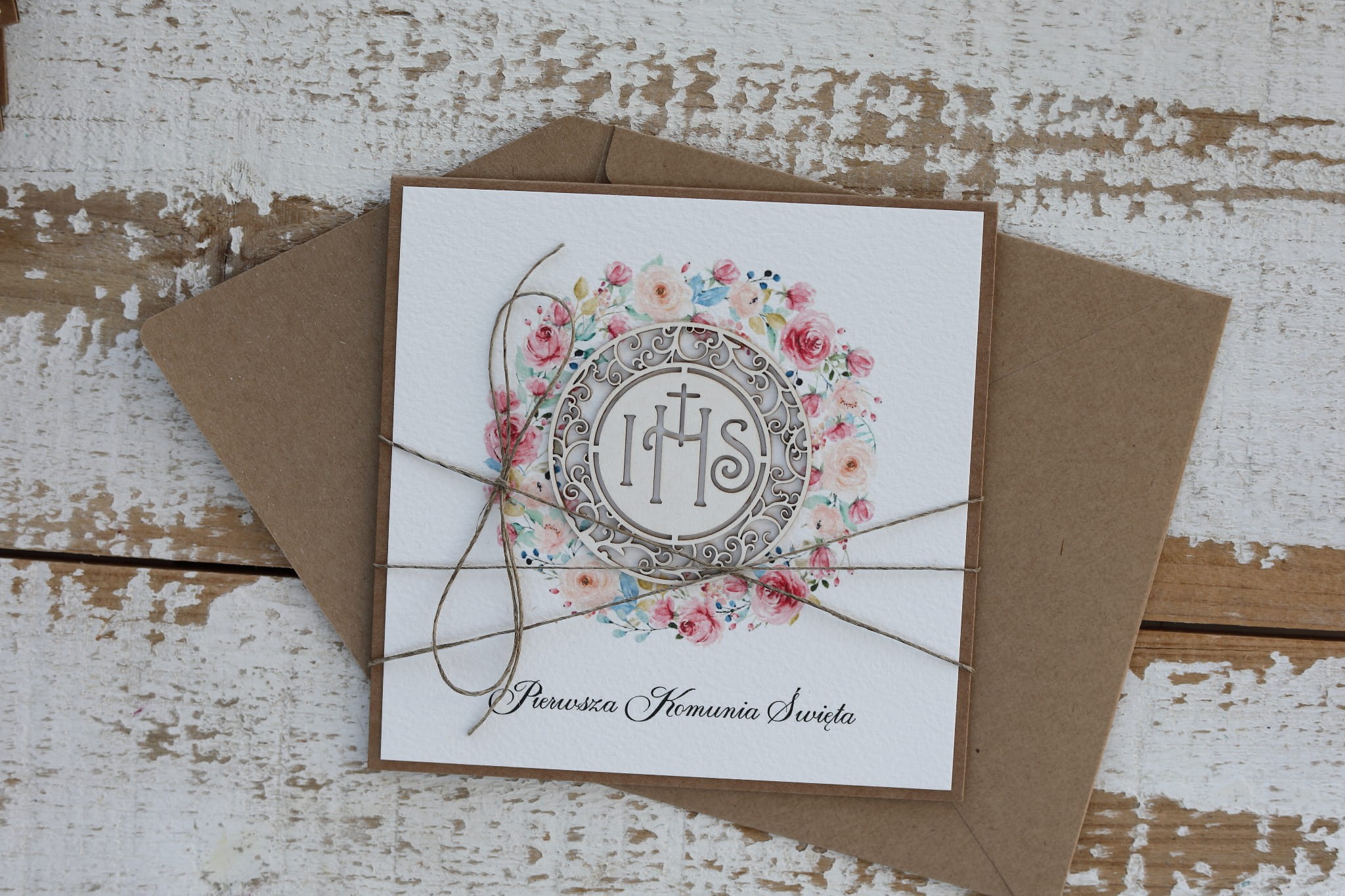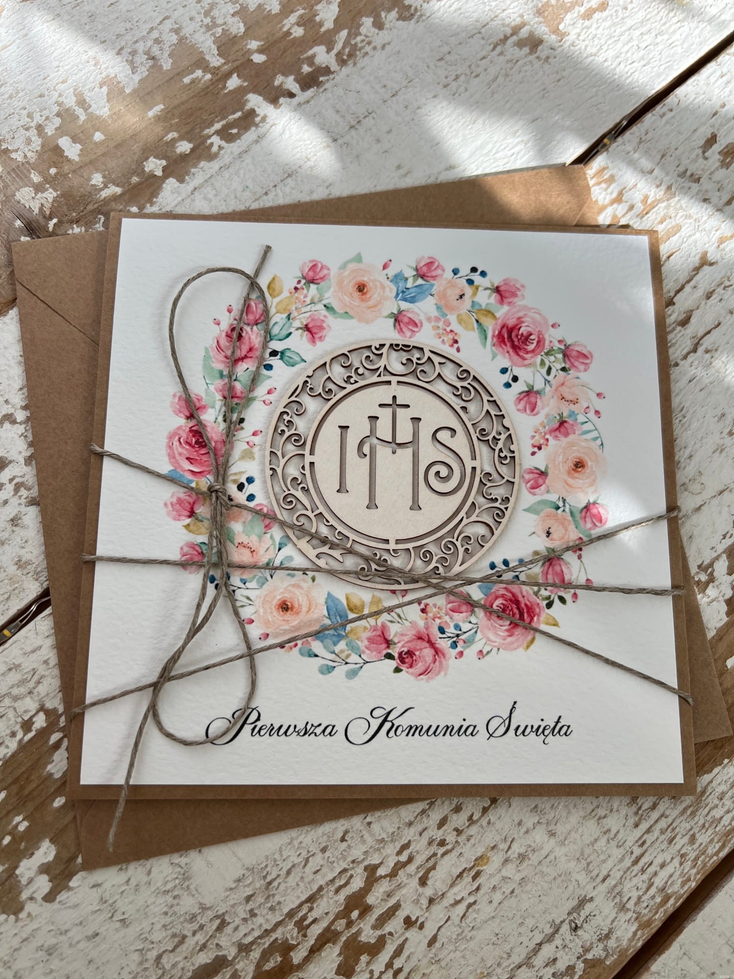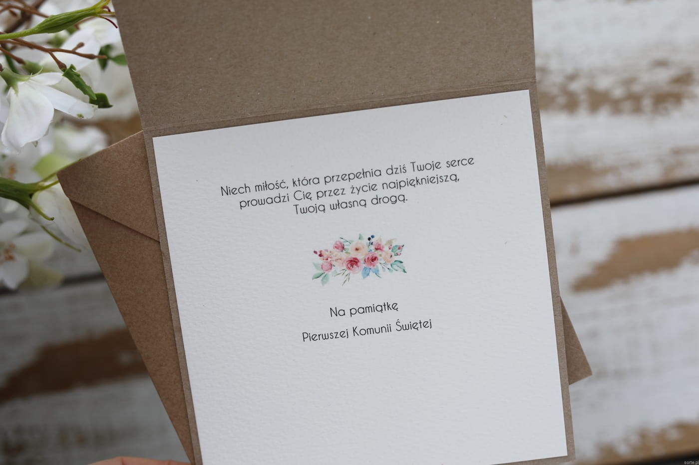 Kartka o wymiarach 14x14 cm wykonana jest z papieru kraftowego oraz papieru bawełnianego w odcieniu śmietanki z użyciem ozdoby tekturkowej. Kartka otwierana do góry, w środku wklejona jest kartka z papieru bawełnianego z gotowymi życzeniami (brak możliwości zmiany). W zestawie z kopertą.