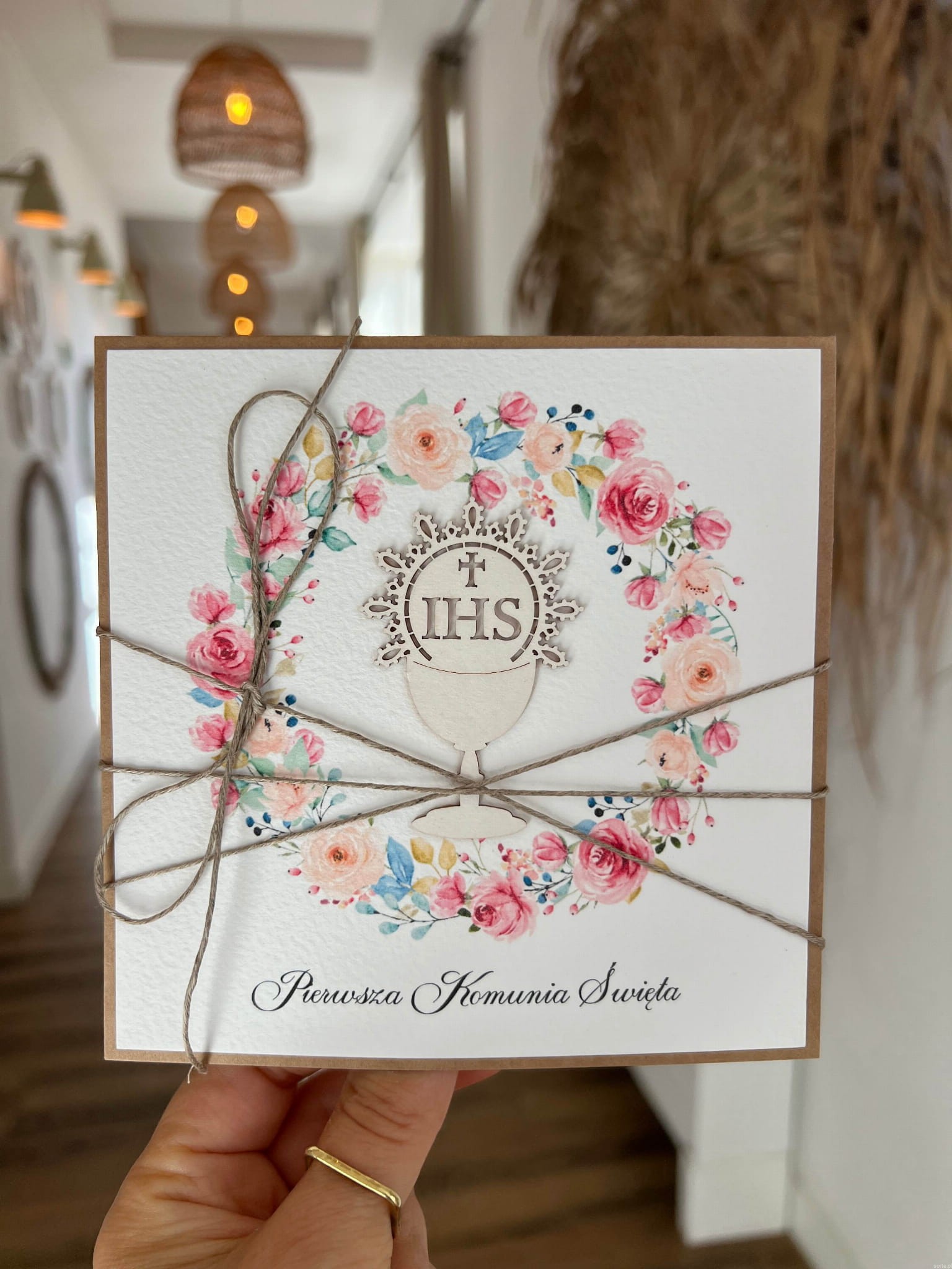 Ręcznie robiona kartka na komunię z życzeniami - dziewczynka komunijna Kielich