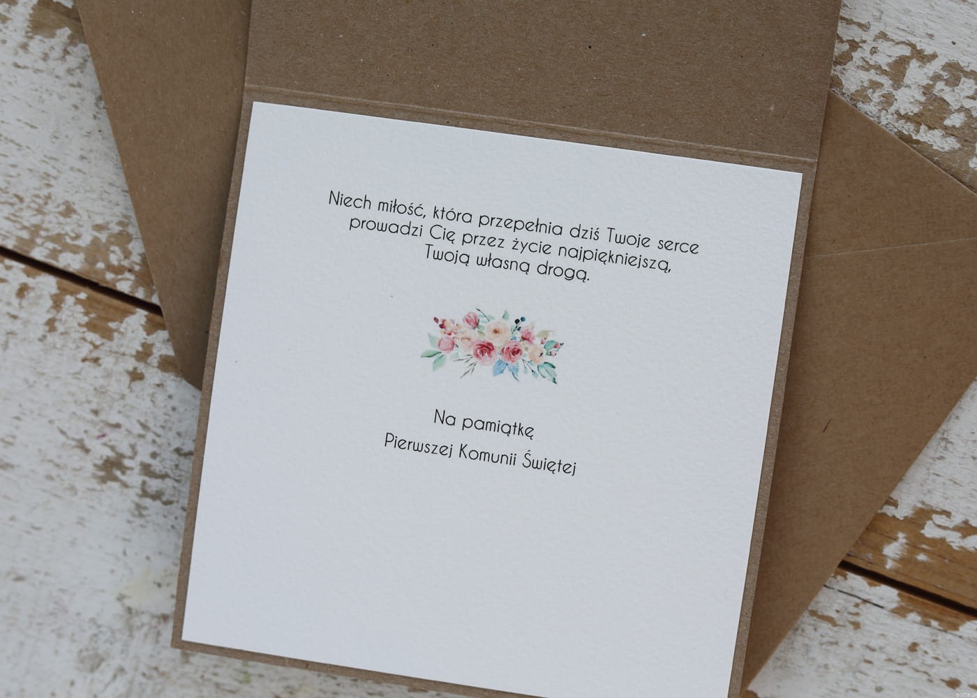 Kartka o wymiarach 14x14 cm wykonana jest z papieru kraftowego oraz papieru bawełnianego w odcieniu śmietanki z użyciem ozdoby tekturkowej. Kartka otwierana do góry, w środku wklejona jest kartka z papieru bawełnianego z gotowymi życzeniami (brak możliwości zmiany). W zestawie z kopertą.