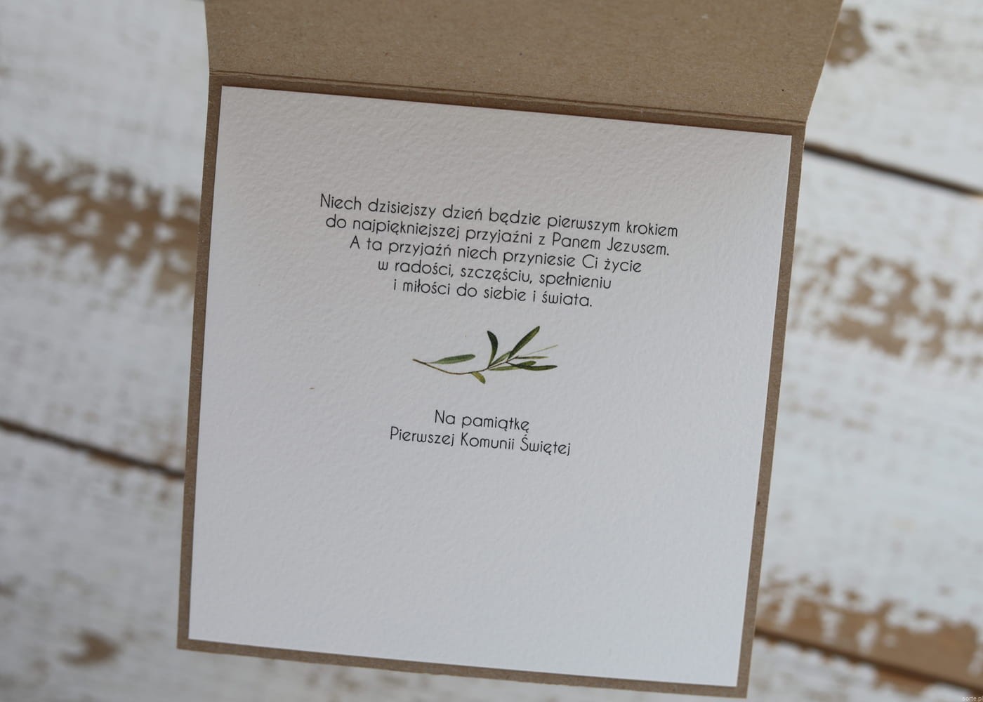 Kartka o wymiarach 14x14 cm wykonana jest z papieru kraftowego oraz papieru bawełnianego w odcieniu śmietanki z użyciem ozdoby tekturkowej dwuwarstwowej. Kartka otwierana do góry, w środku wklejona jest kartka z papieru bawełnianego z gotowymi życzeniami (brak możliwości zmiany). W zestawie z kopertą.