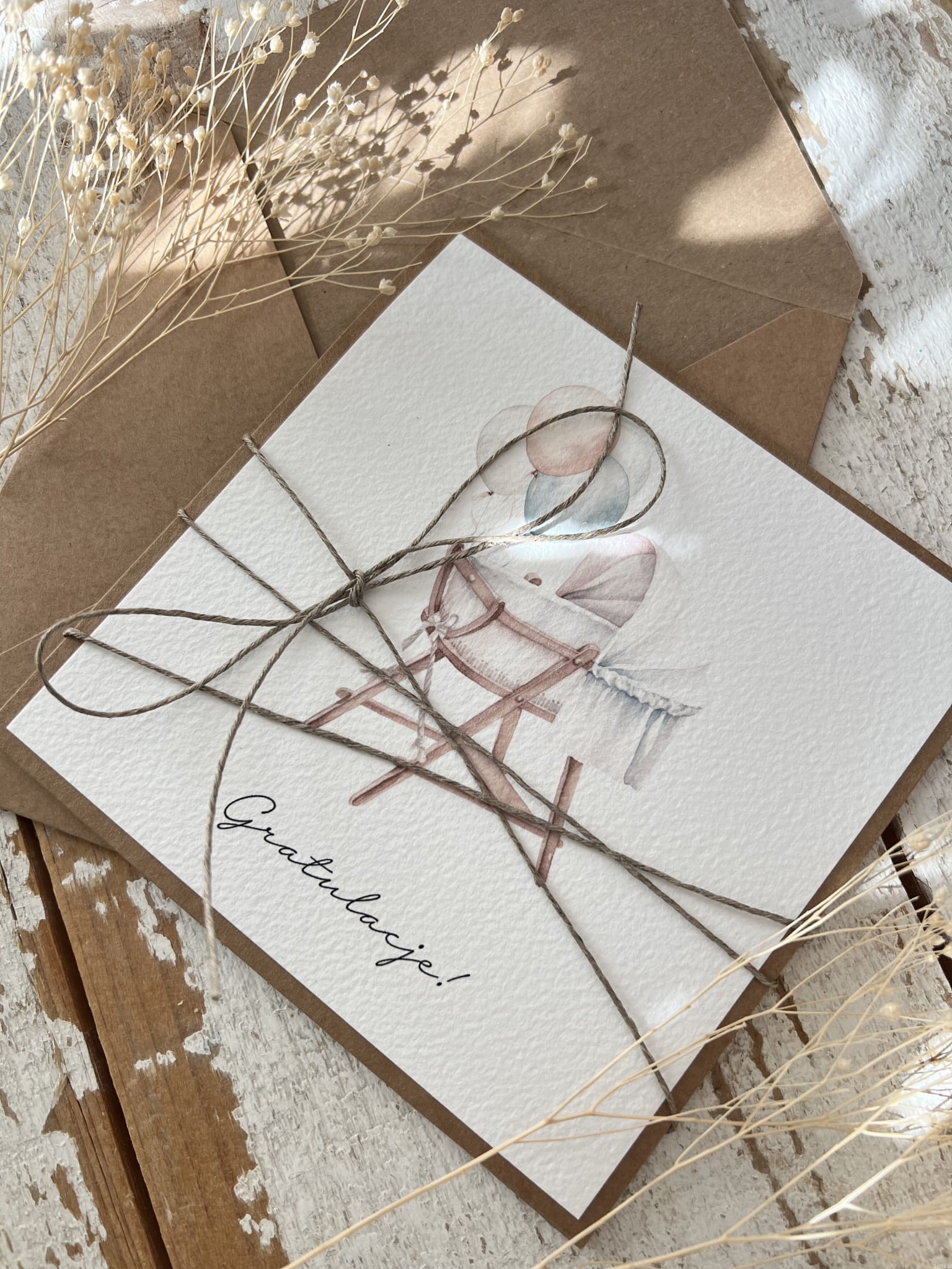 Ręcznie robiona kartka na narodziny dziecka - gratulacje z okazji narodzin synka córeczki, córki kołyska