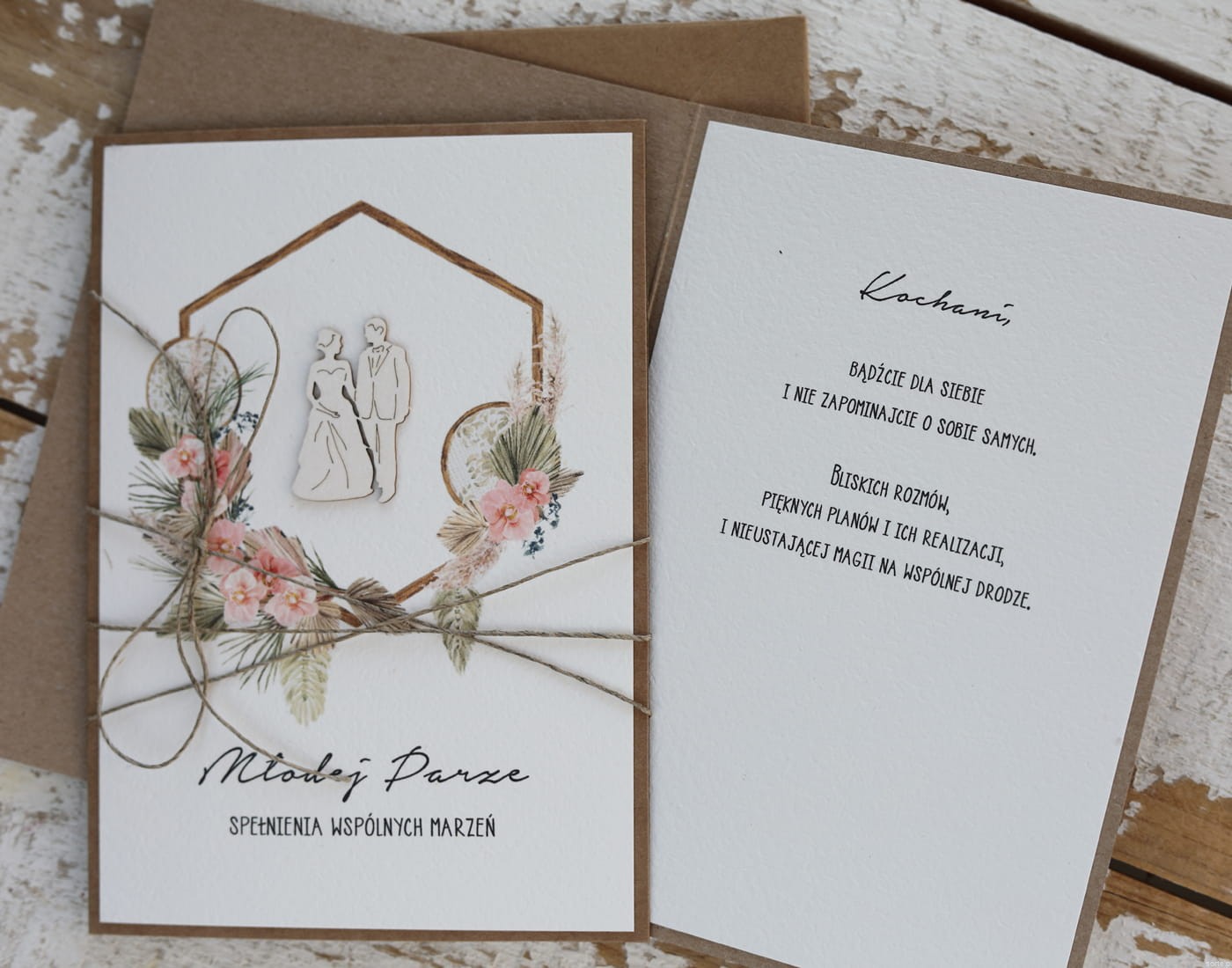 W środku wklejona jest kartka z papieru bawełnianego z gotowymi życzeniami. Brak możliwości zmiany.
