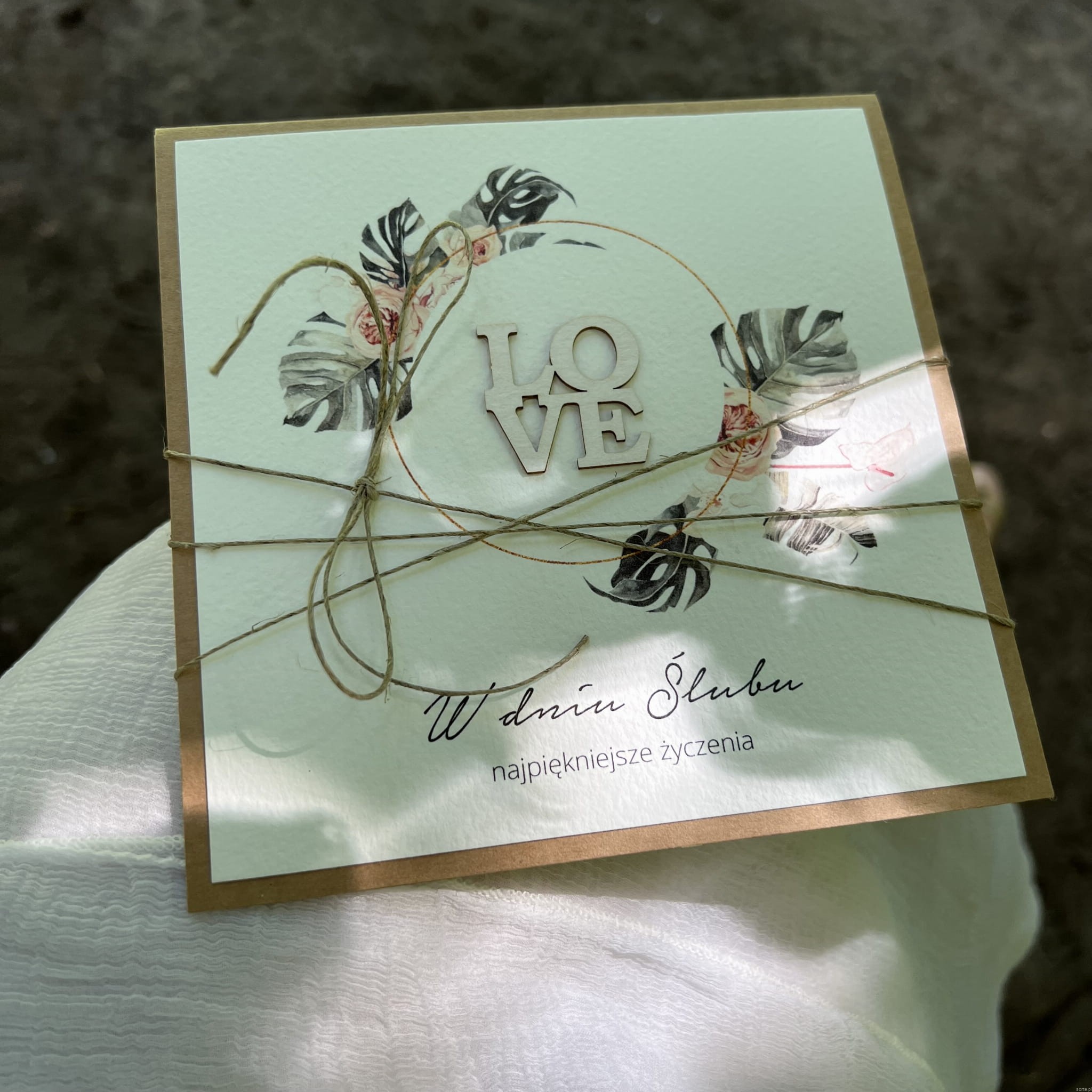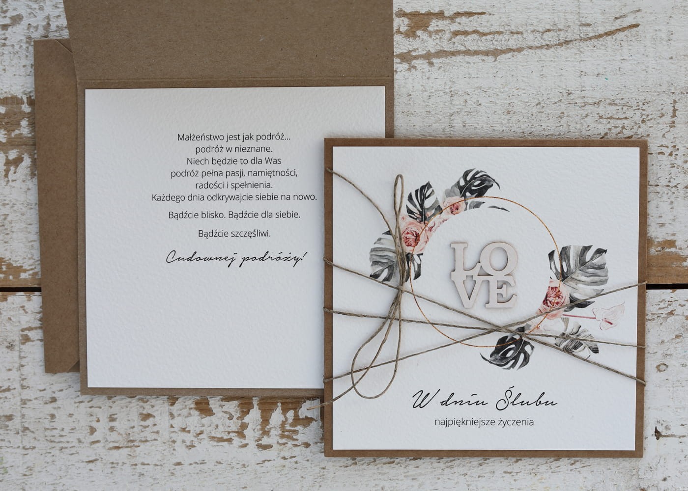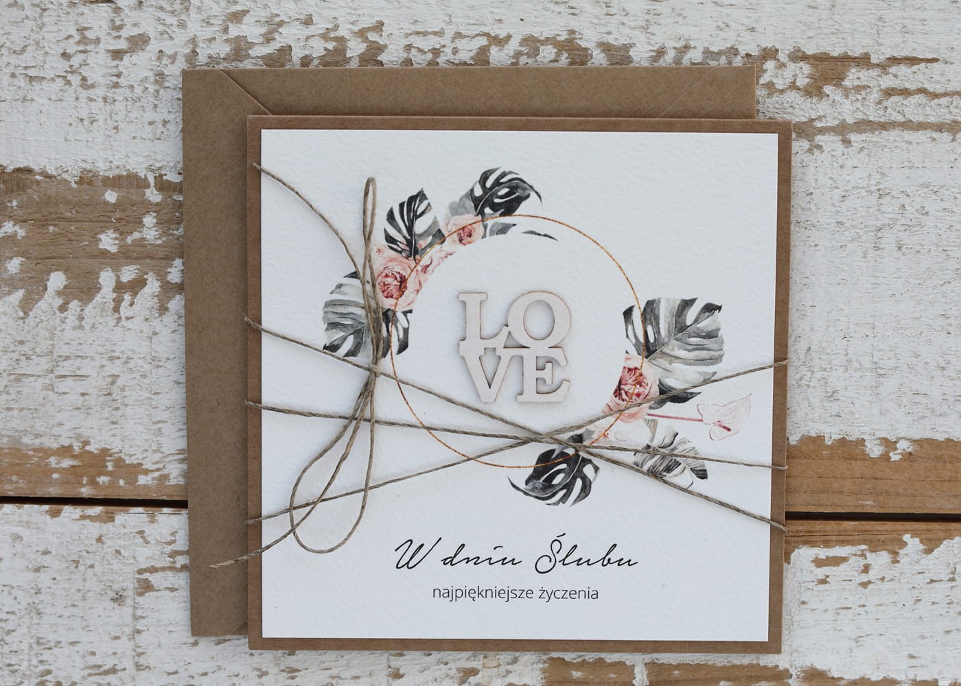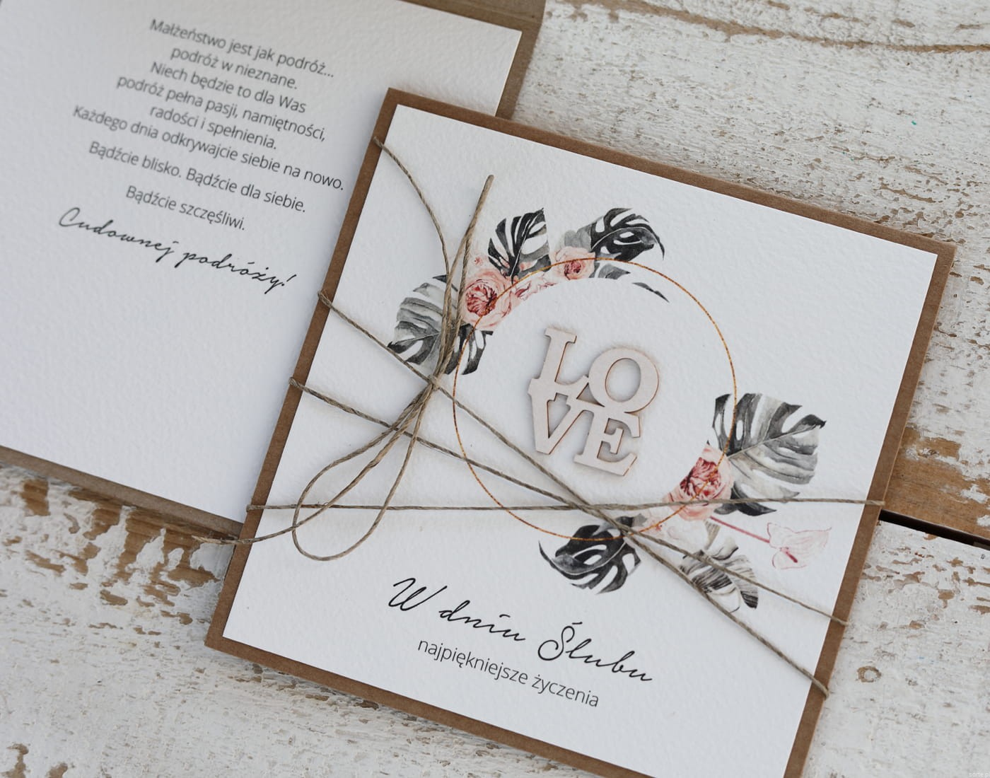 Ręcznie robiona kartka na ślub - ślubna z życzeniami monstera LOVE