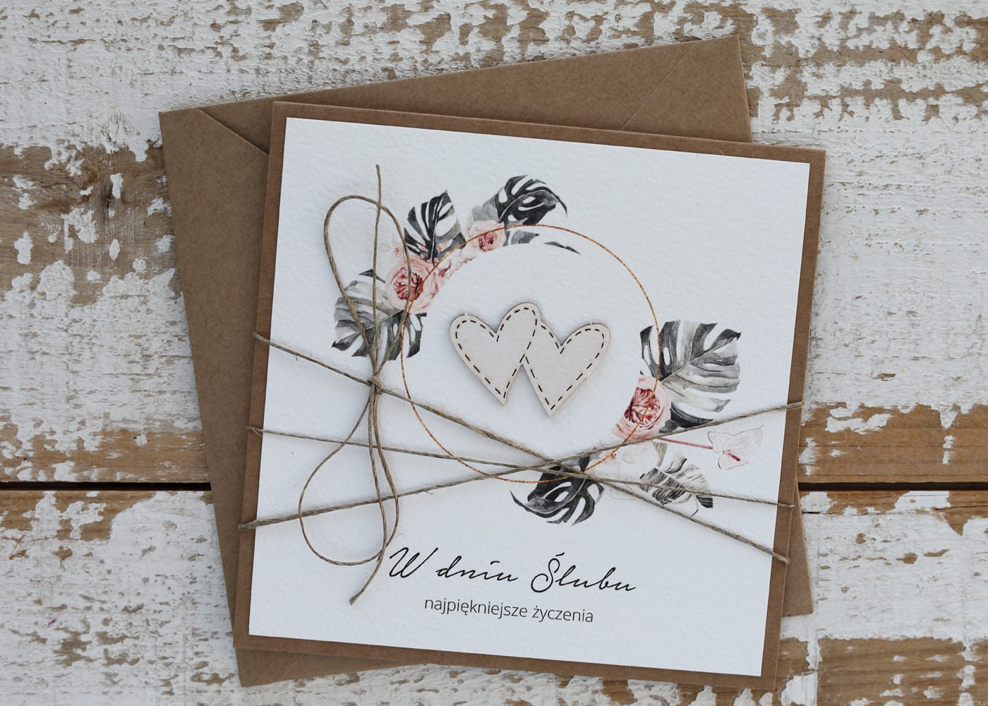 Ręcznie robiona kartka na ślub - ślubna z życzeniami monstera serca