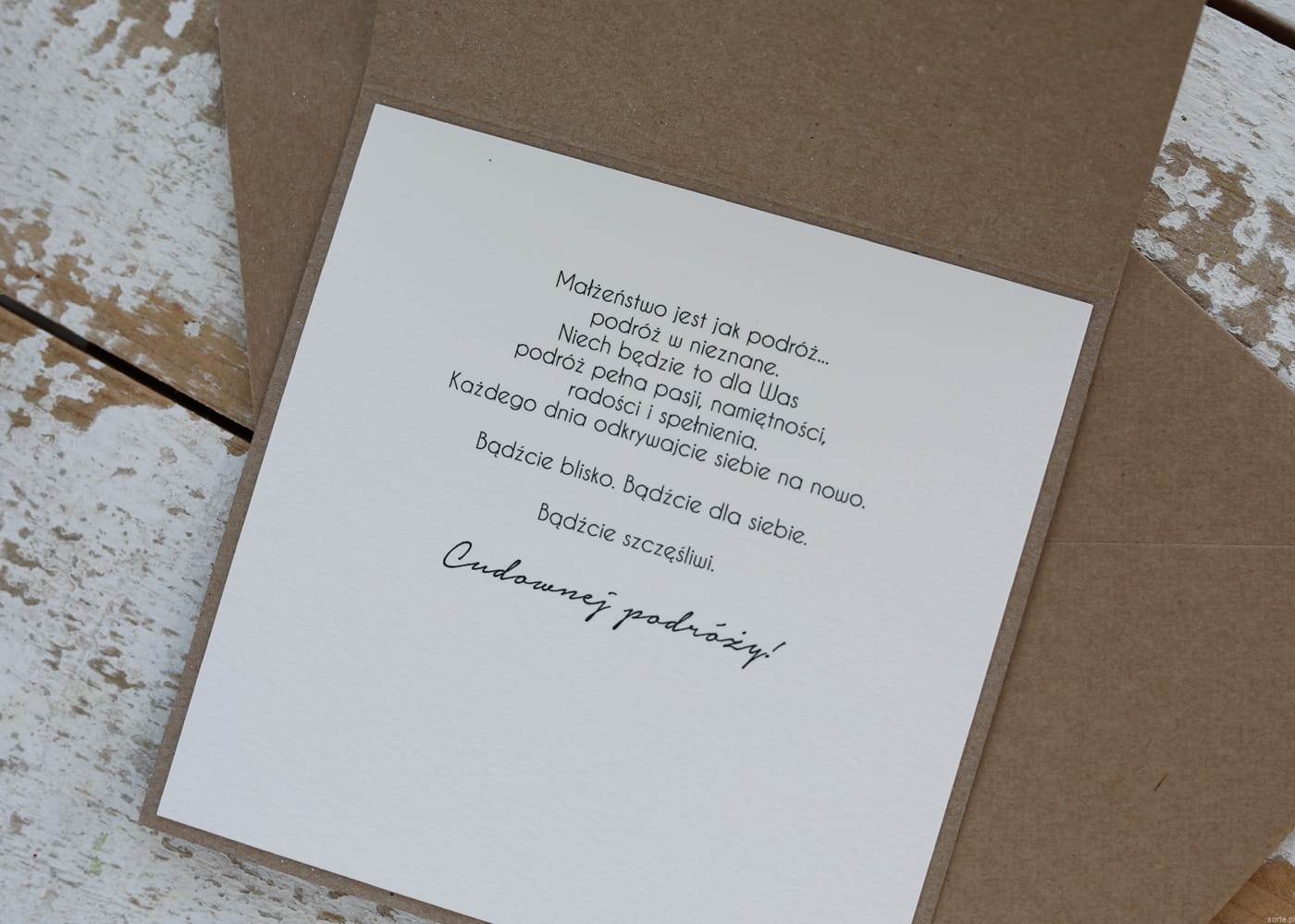 W środku wklejona jest kartka z papieru bawełnianego z gotowymi życzeniami. Brak możliwości zmiany.
