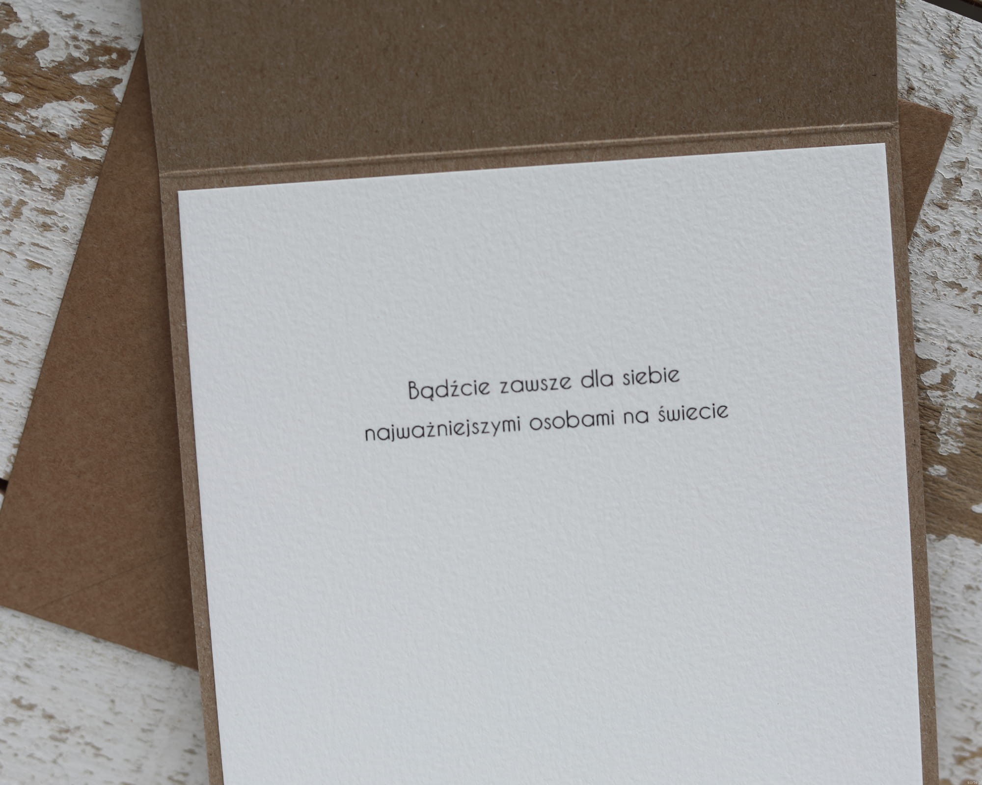 W środku wklejona jest kartka z papieru bawełnianego z gotowymi życzeniami.