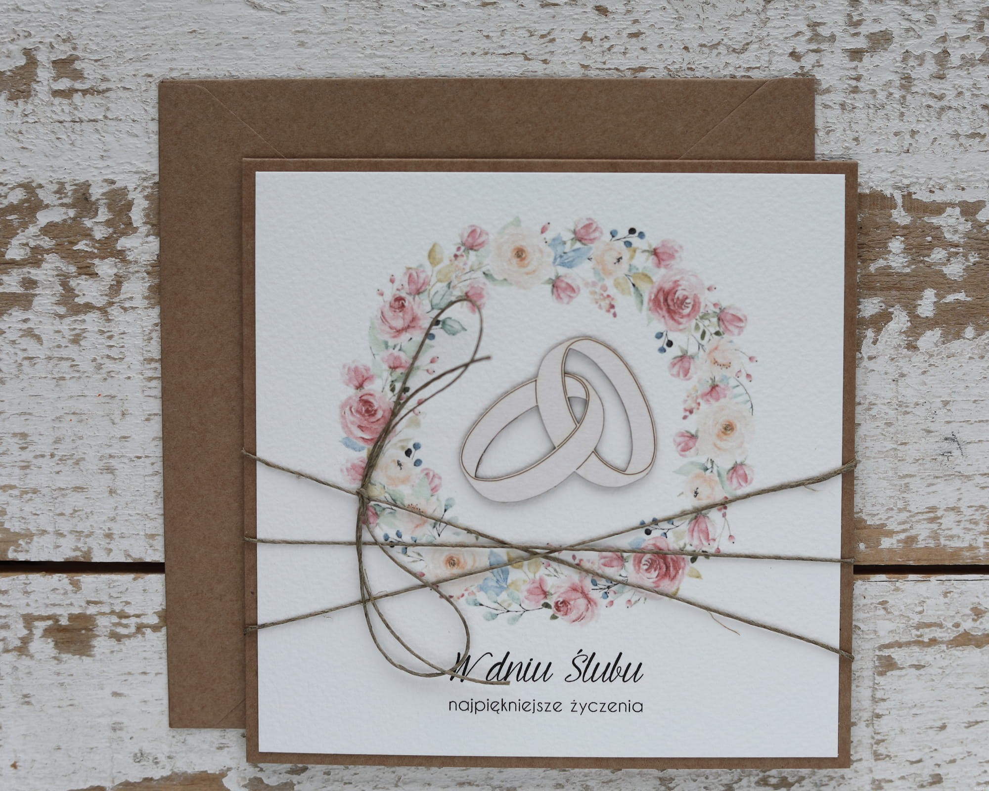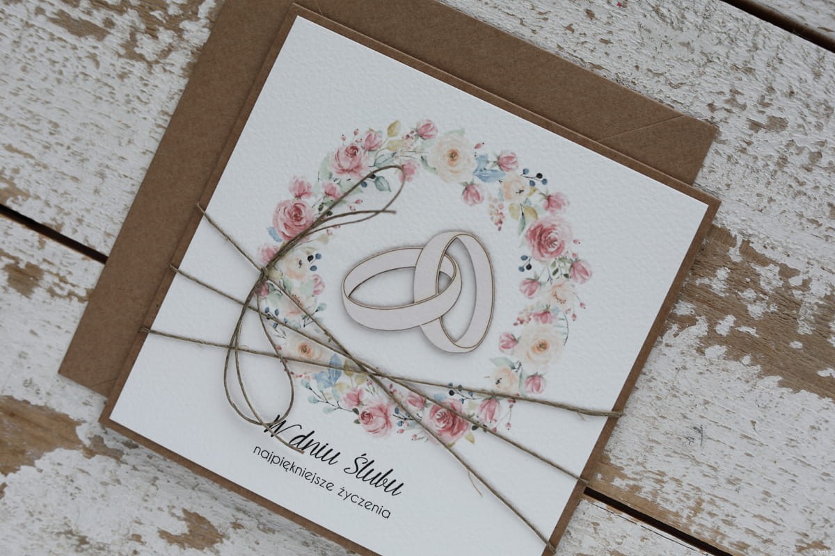 Ręcznie robiona kartka na ślub z obrączkami w wianuszku
