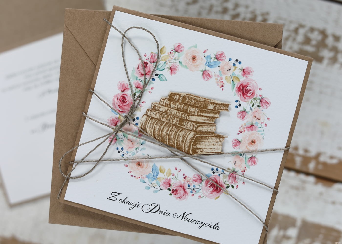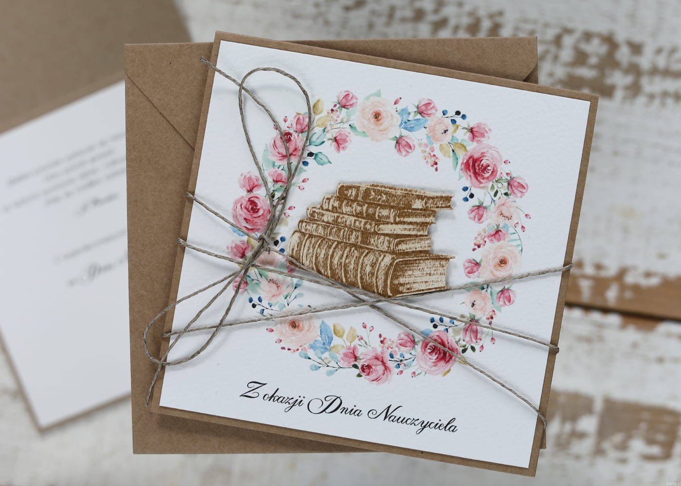 Kartka wykonana jest na bazie papieru kraftowego z użyciem starannie wyselekcjonowanego papieru bawełnianego w kolorze ecri oraz ozdoby tekturkowej. Zestaw przewiązany jest lnianym sznureczkiem.