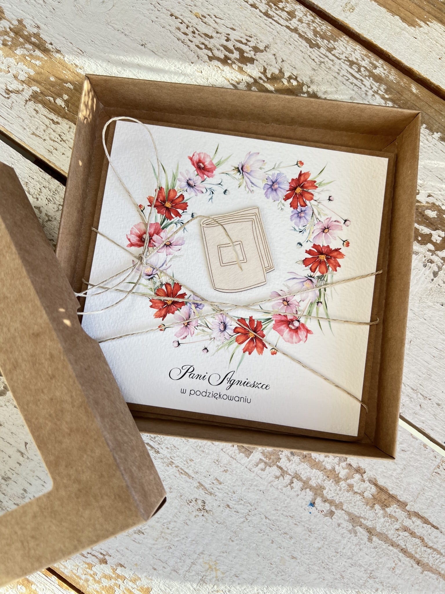 Wymiary: kartka ok. 14x14 cm pudełko z okienkiem 15x15x2,5cm