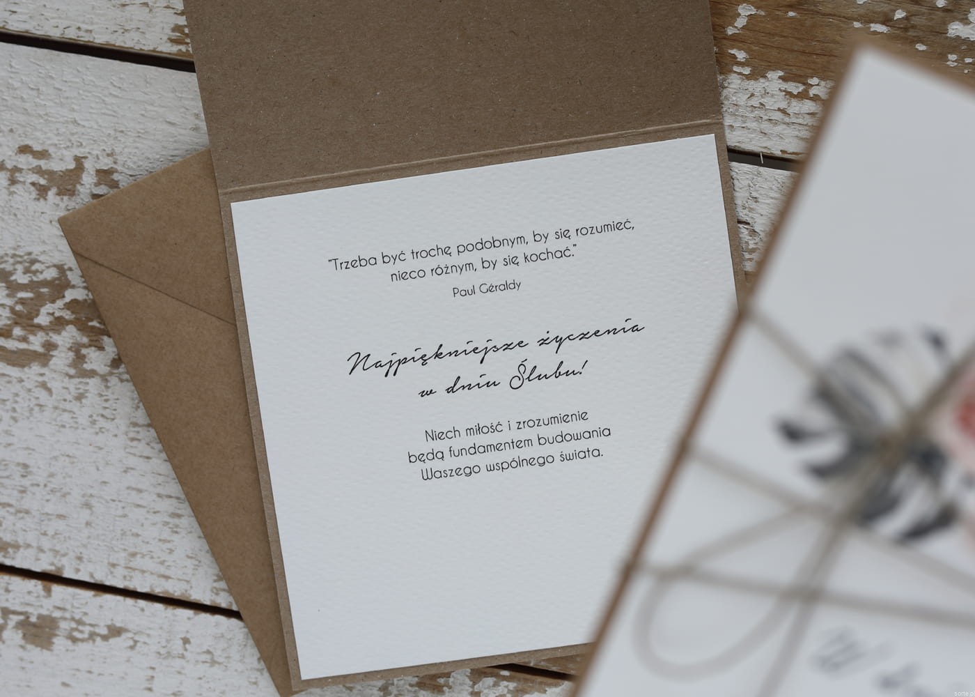 W środku wklejona jest kartka z papieru akwarelowego z życzeniami.