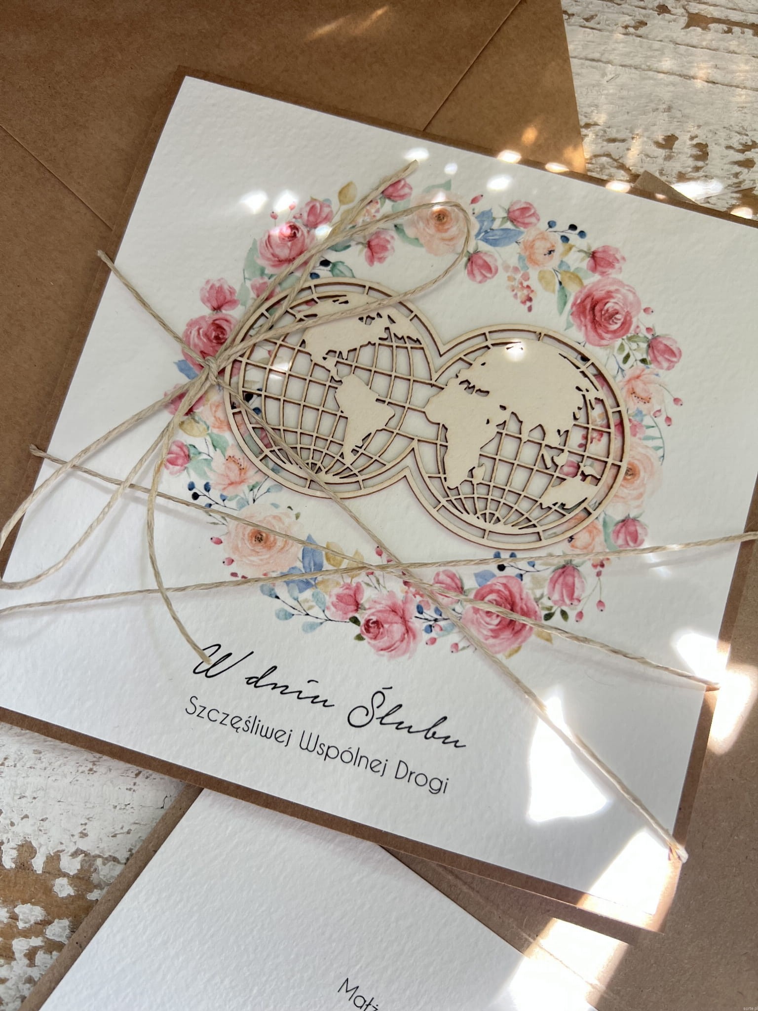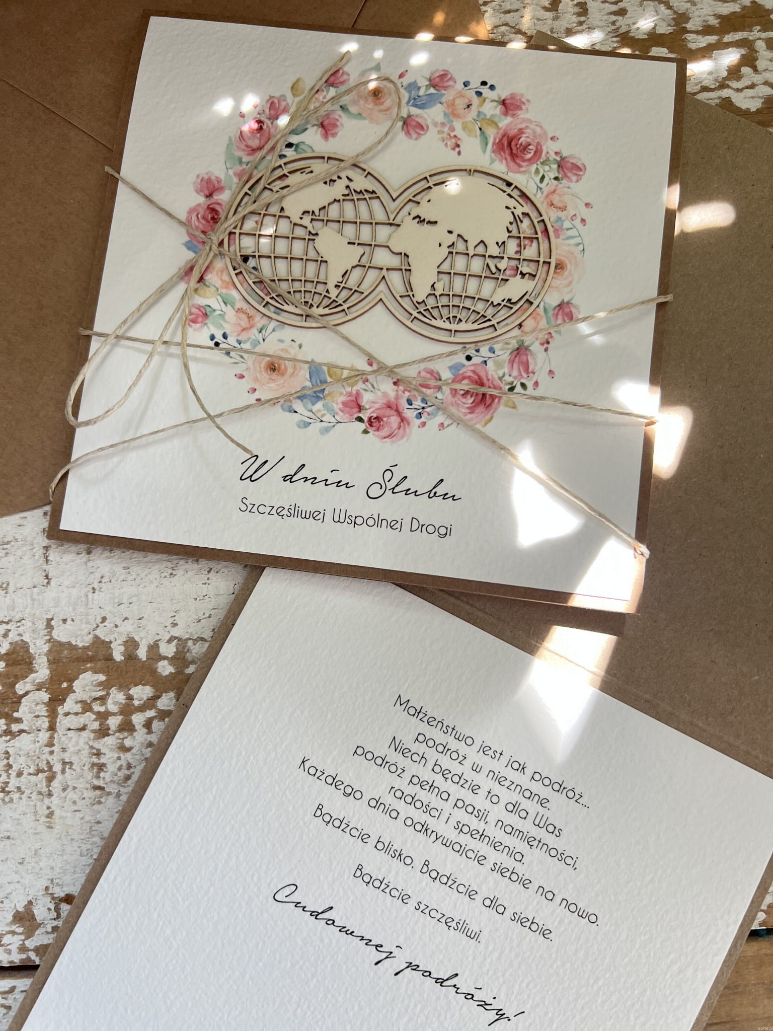 Ręcznie robiona kartka ślubna z życzeniami dla młodej pary - podróżników