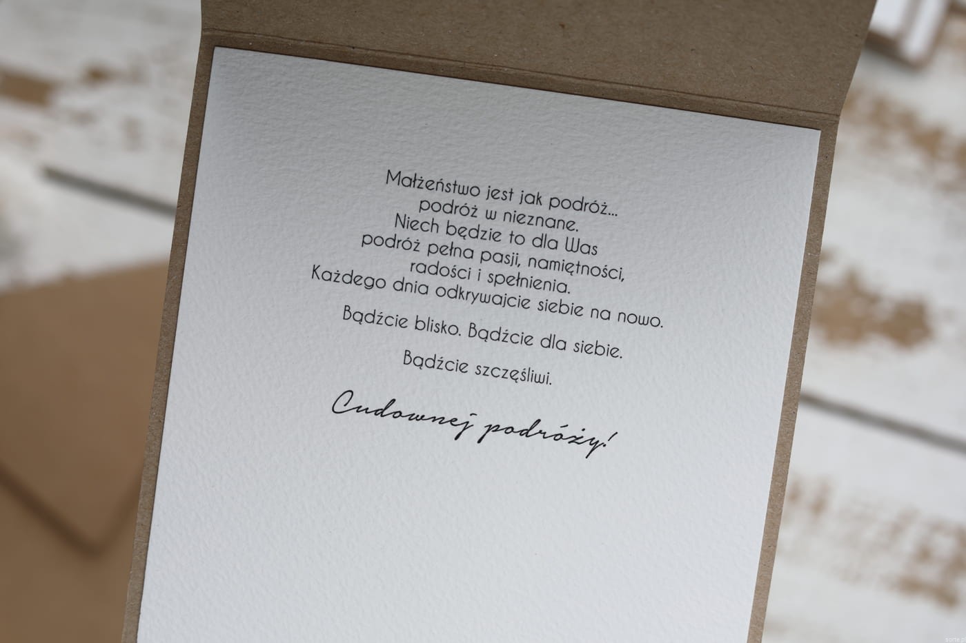 Ręcznie robiona kartka ślubna z życzeniami dla młodej pary - podróżników