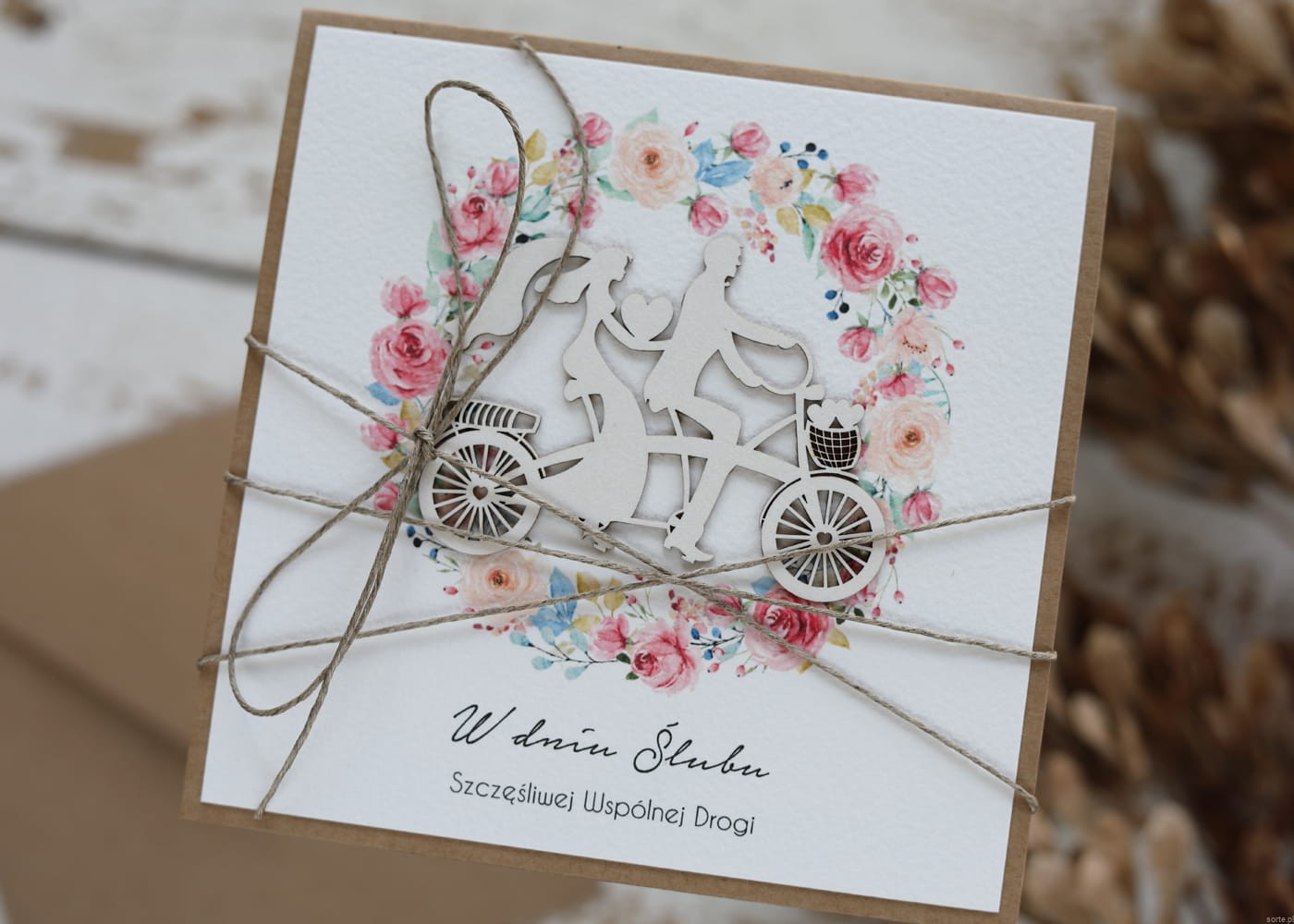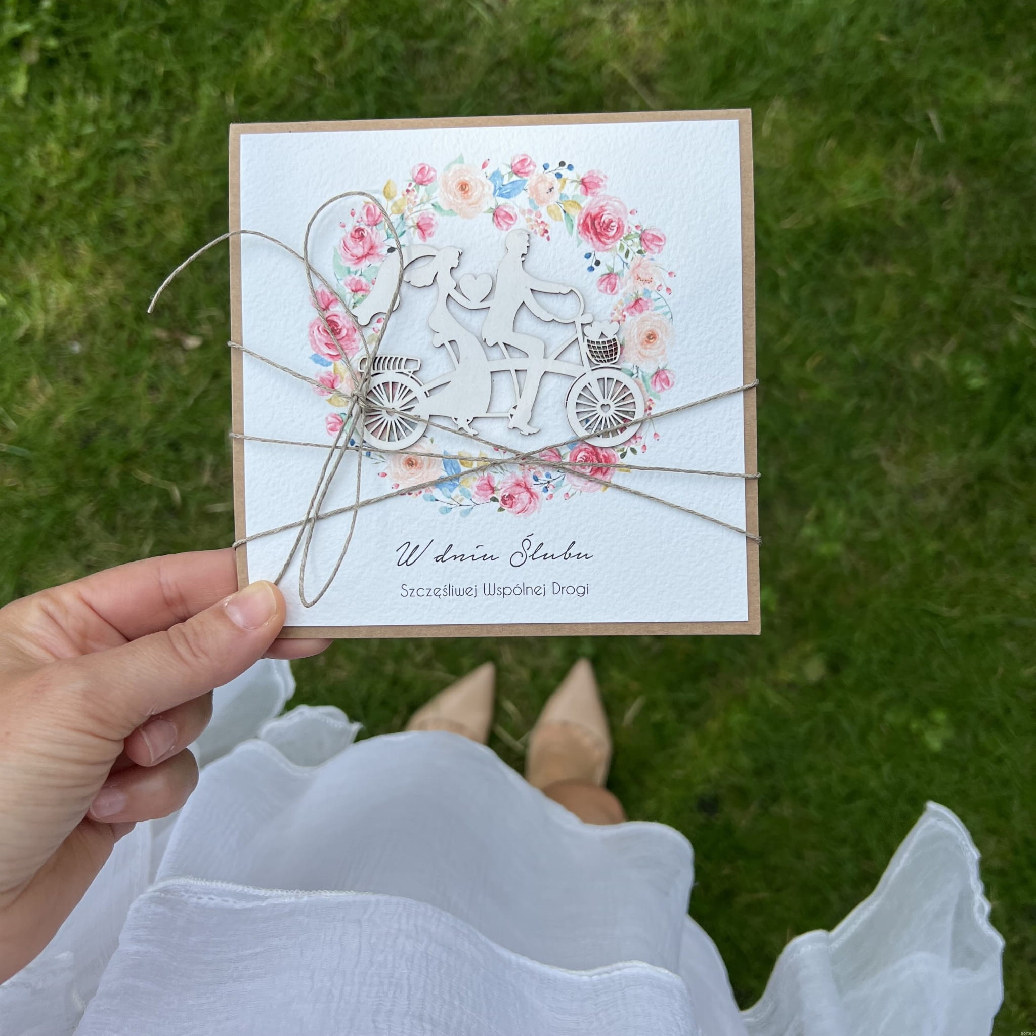Ręcznie robiona kartka ślubna z życzeniami dla młodej pary - rower tandem