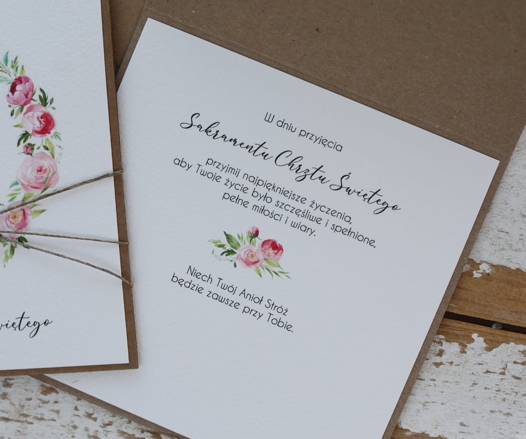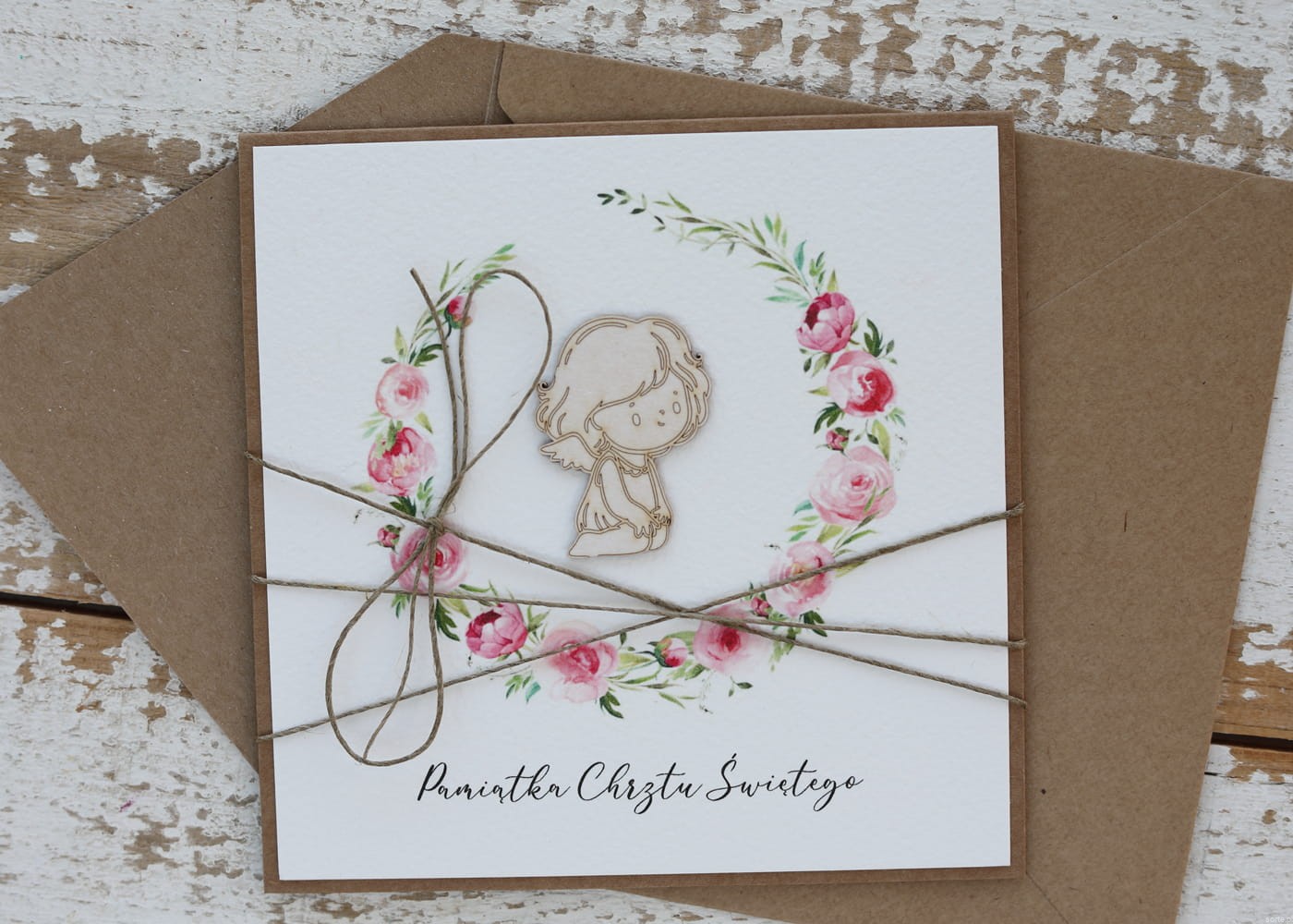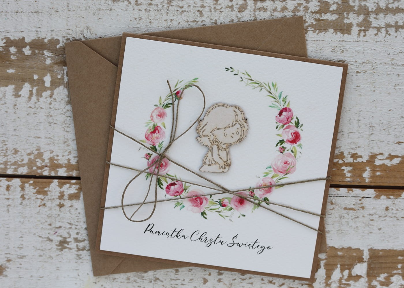 Kartka na chrzest o wymiarach 14x14 cm wykonana jest z papieru kraftowego oraz papieru bawełnianego w kolorze śmietanki z użyciem ozdoby tekturkowej. Kartka otwierana do góry, w środku wklejona jest kartka z papieru bawełnianego z gotowymi życzeniami (brak możliwości zmiany). W zestawie z kopertą.