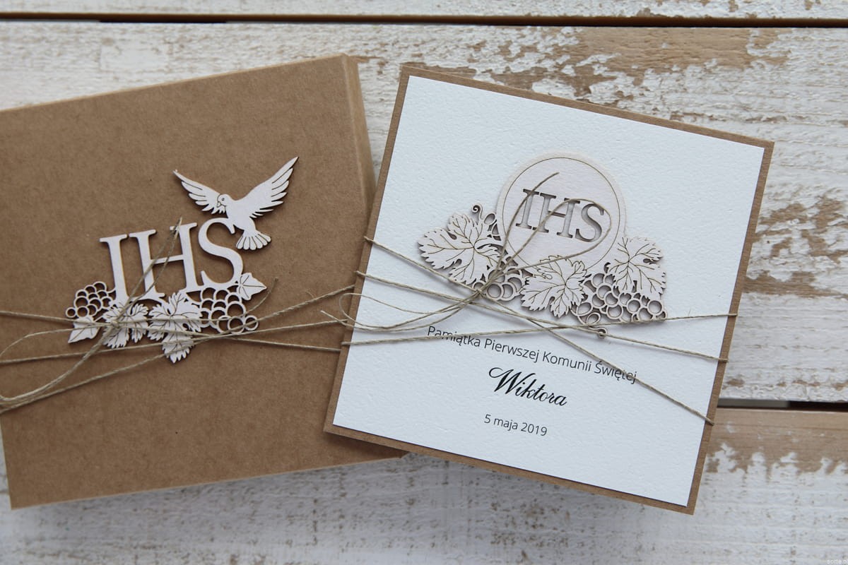 Rustykalna kartka na komunię z personalizacją wraz z pudełkiem.