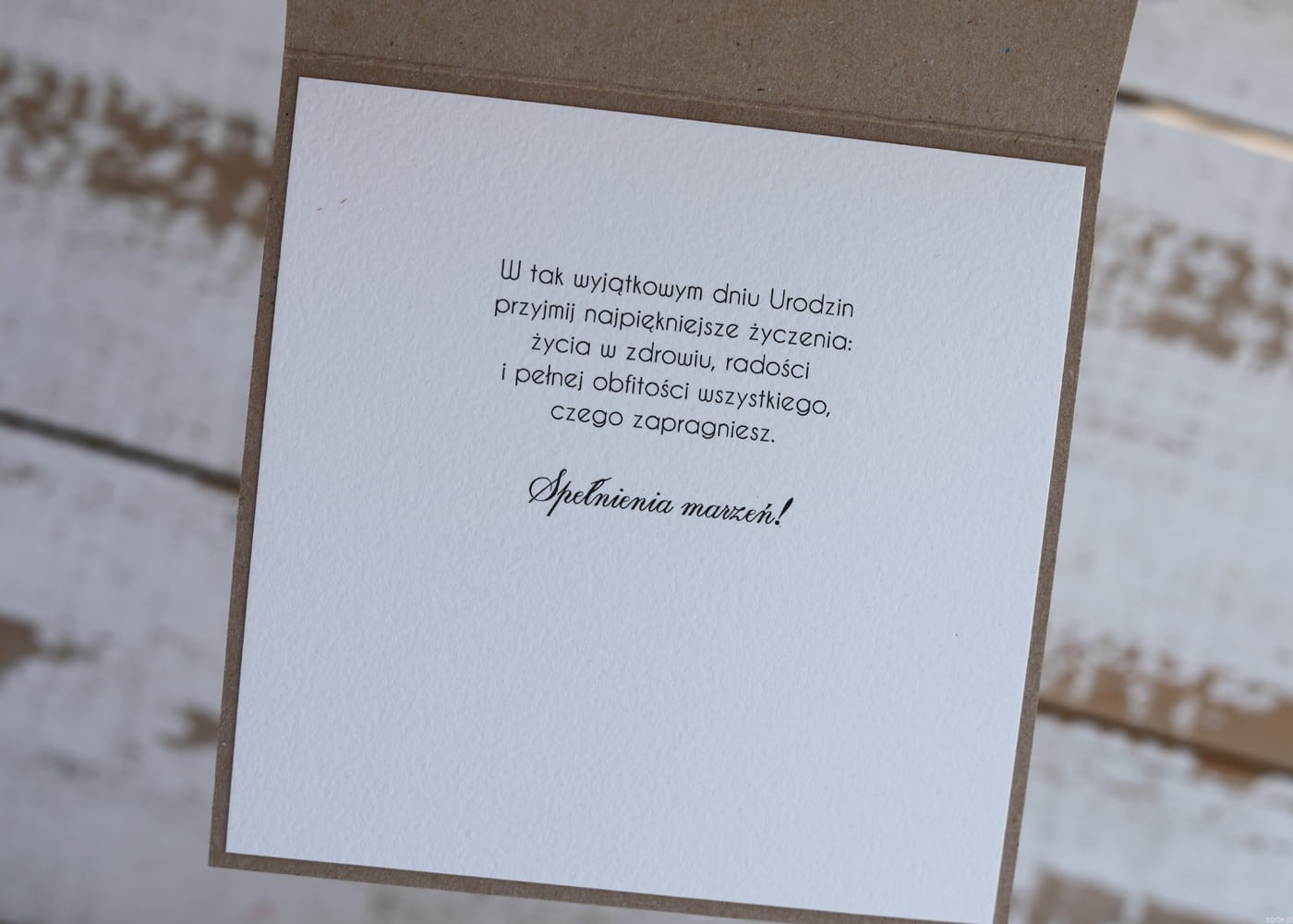 W środku wklejona jest jedna kartka z papieru bawełnianego z życzeniami bądź kartka pusta, gotowa do wpisania życzeń własnoręcznie.