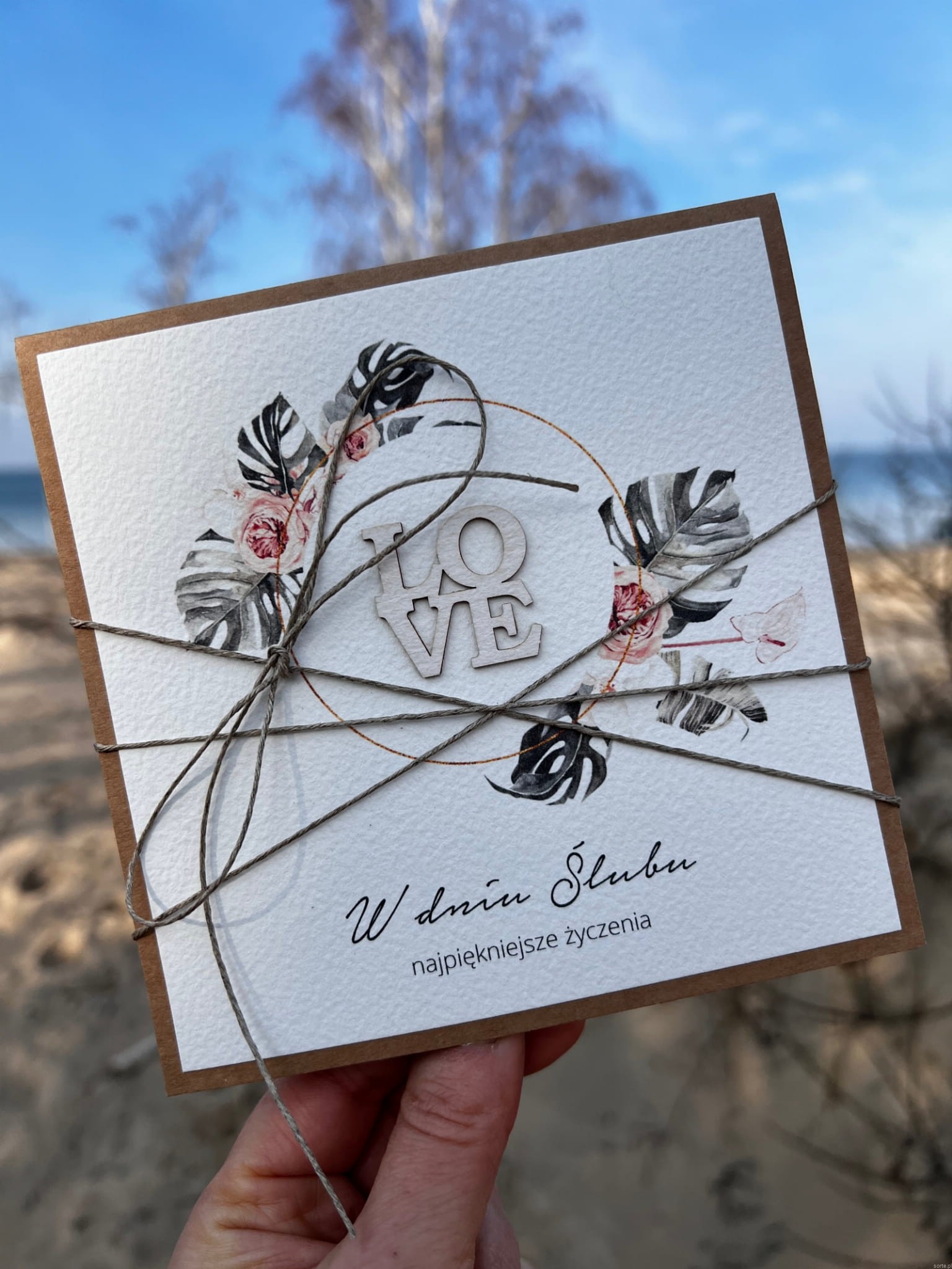 Kartka ślubna wykonana jest na bazie papieru kraftowego z użyciem starannie wyselekcjonowanego papieru bawełnianego w kolorze śmietanki oraz ozdoby tekturkowej. Kartka przewiązana jest lnianym sznureczkiem.