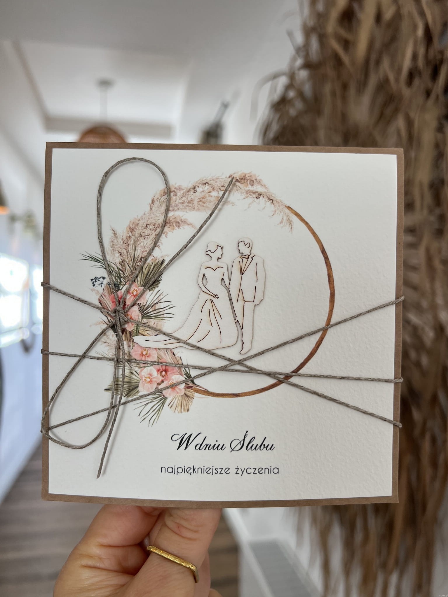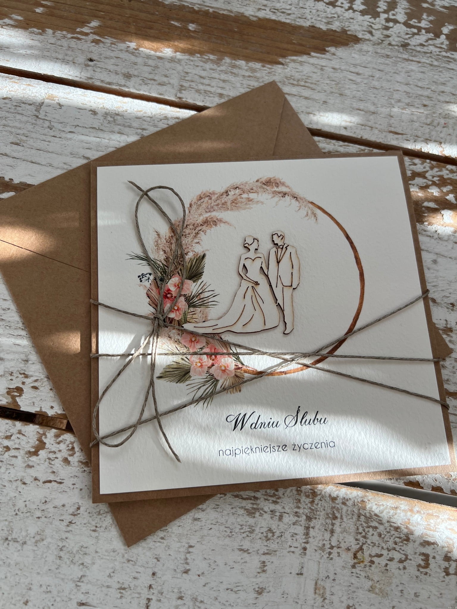Kartka ślubna wykonana jest na bazie papieru kraftowego z użyciem starannie wyselekcjonowanego papieru bawełnianego w kolorze brzoskwini oraz ozdoby tekturkowej. Kartka przewiązana jest lnianym sznureczkiem.