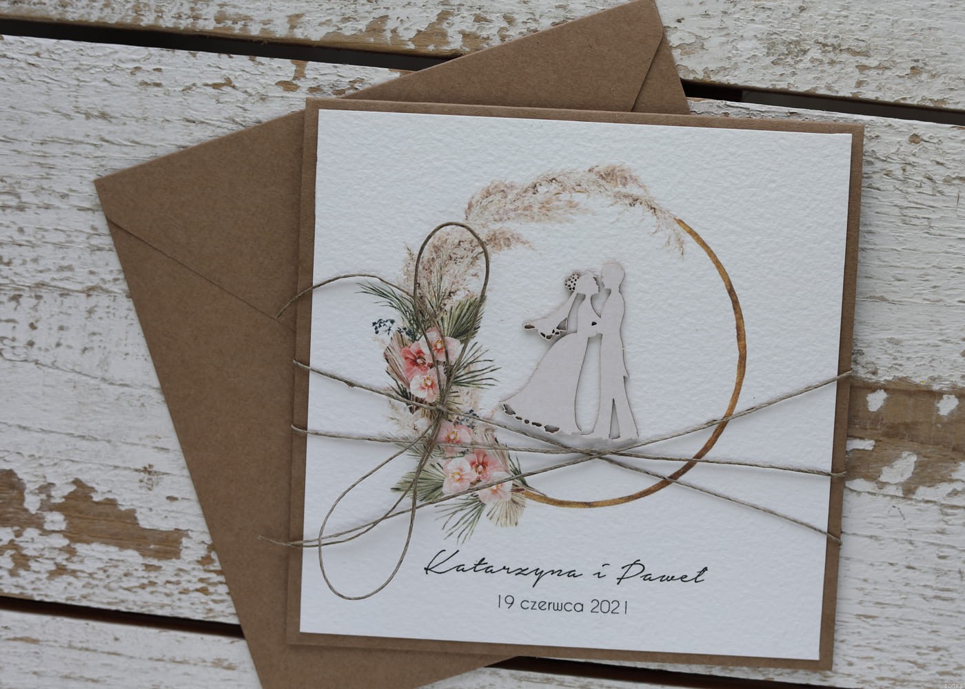 Rustykalna kartka ślubna ręcznie robiona w kopercie z parą młodą w wianku