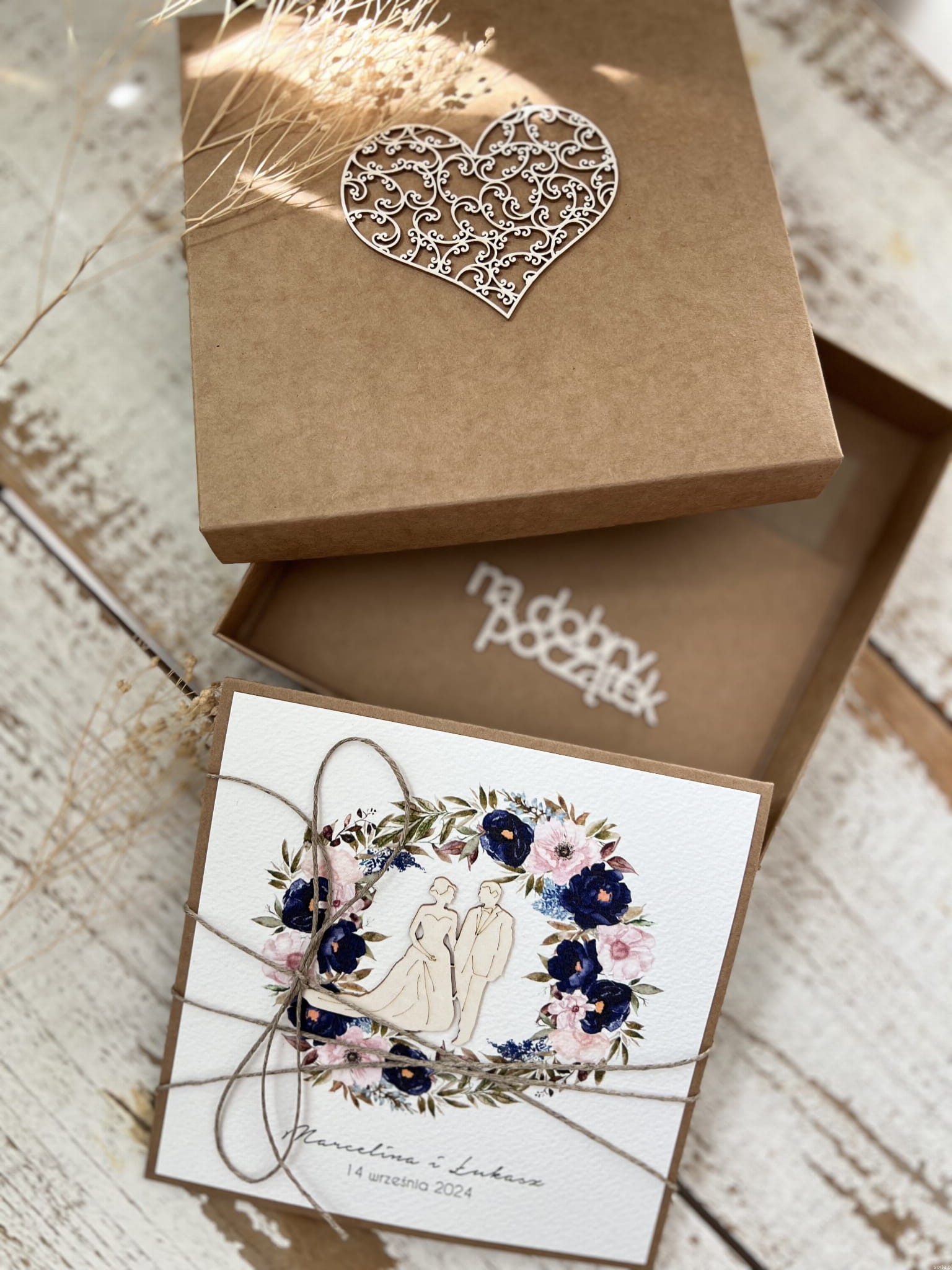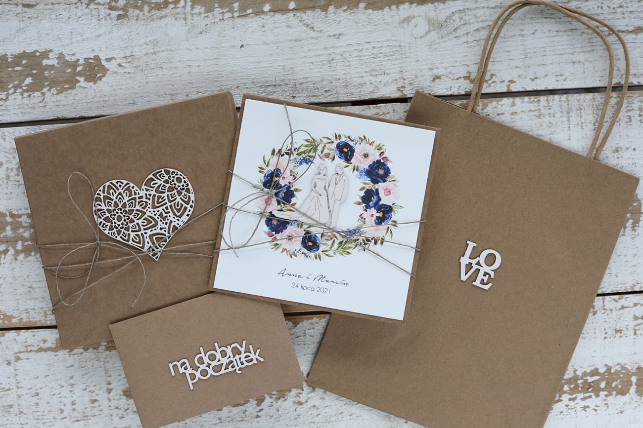 Kartka ślubna wykonana jest na bazie papieru kraftowego z użyciem starannie wyselekcjonowanego papieru bawełnianego w kolorze ecri oraz ozdoby tekturkowej. Zestaw przewiązany jest lnianym sznureczkiem.
