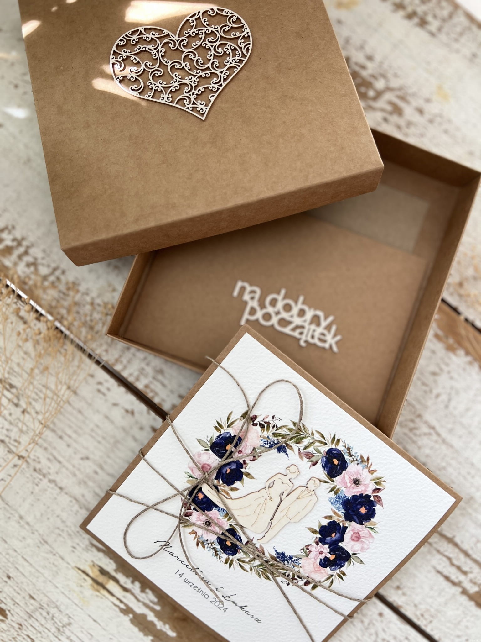Zestaw zawiera kartkę, pudełko i kopertę z ozdobą.