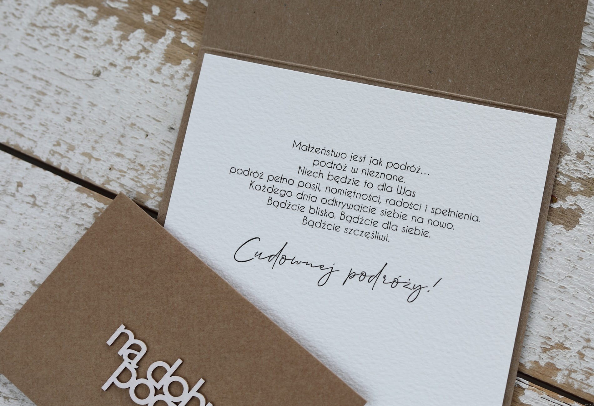 W środku wklejona jest jedna kartka z papieru bawełnianego z życzeniami bądź kartka pusta, gotowa do wpisania życzeń własnoręcznie.