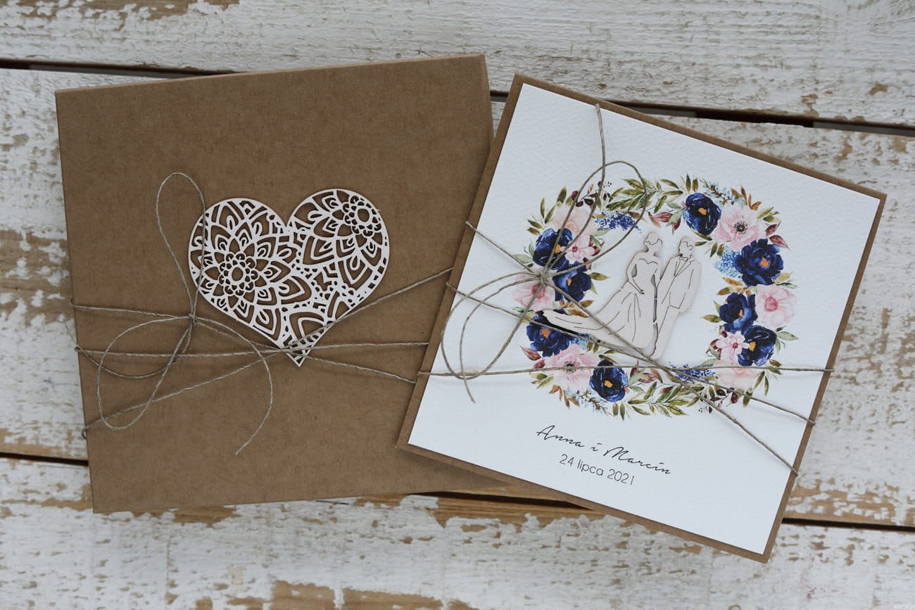 Rustykalna kartka ślubna ręcznie robiona z personalizacją i życzeniami - wianek granat-róż 2