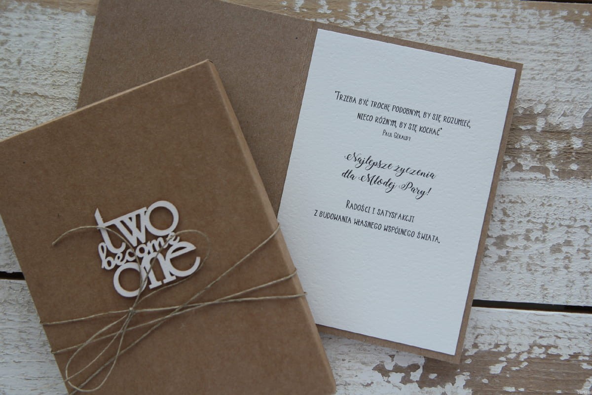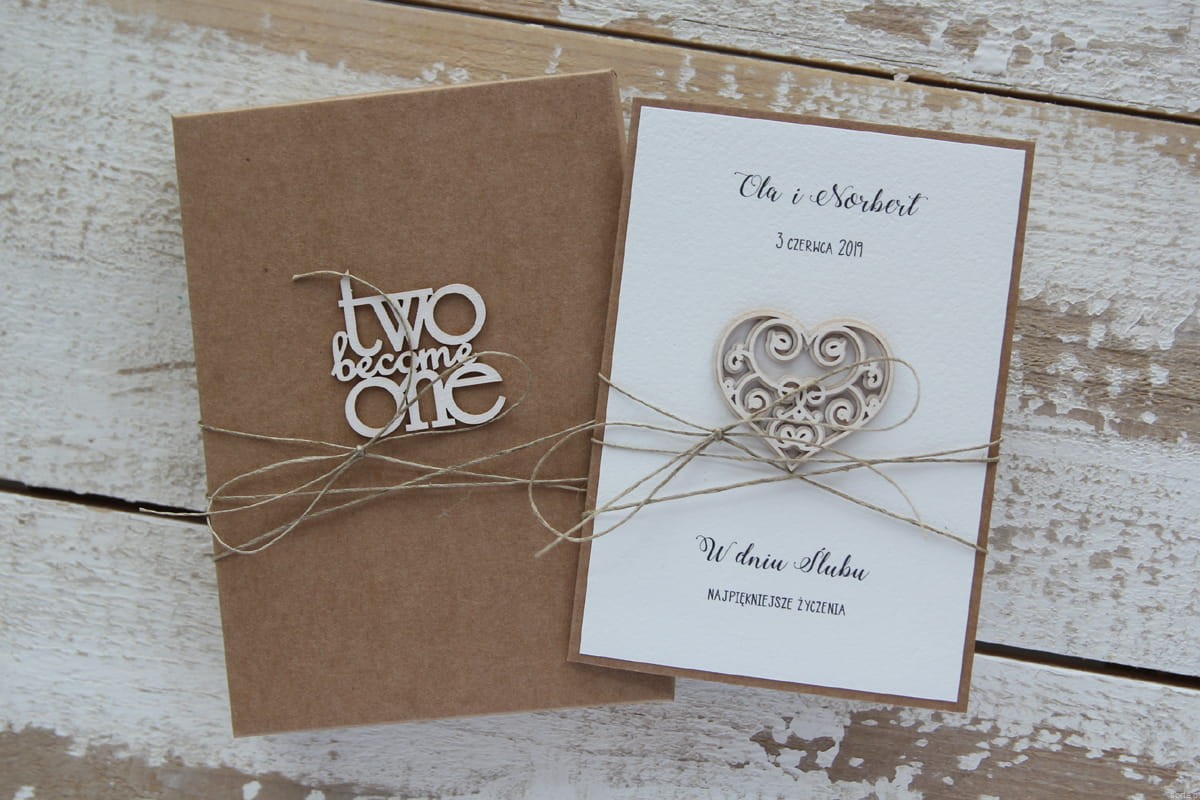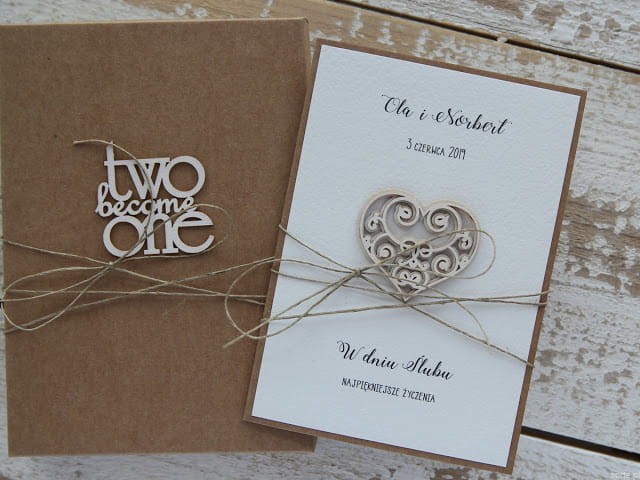 Rustykalna kartka ślubna ręcznie robiona z personalizacją 2 become 1.