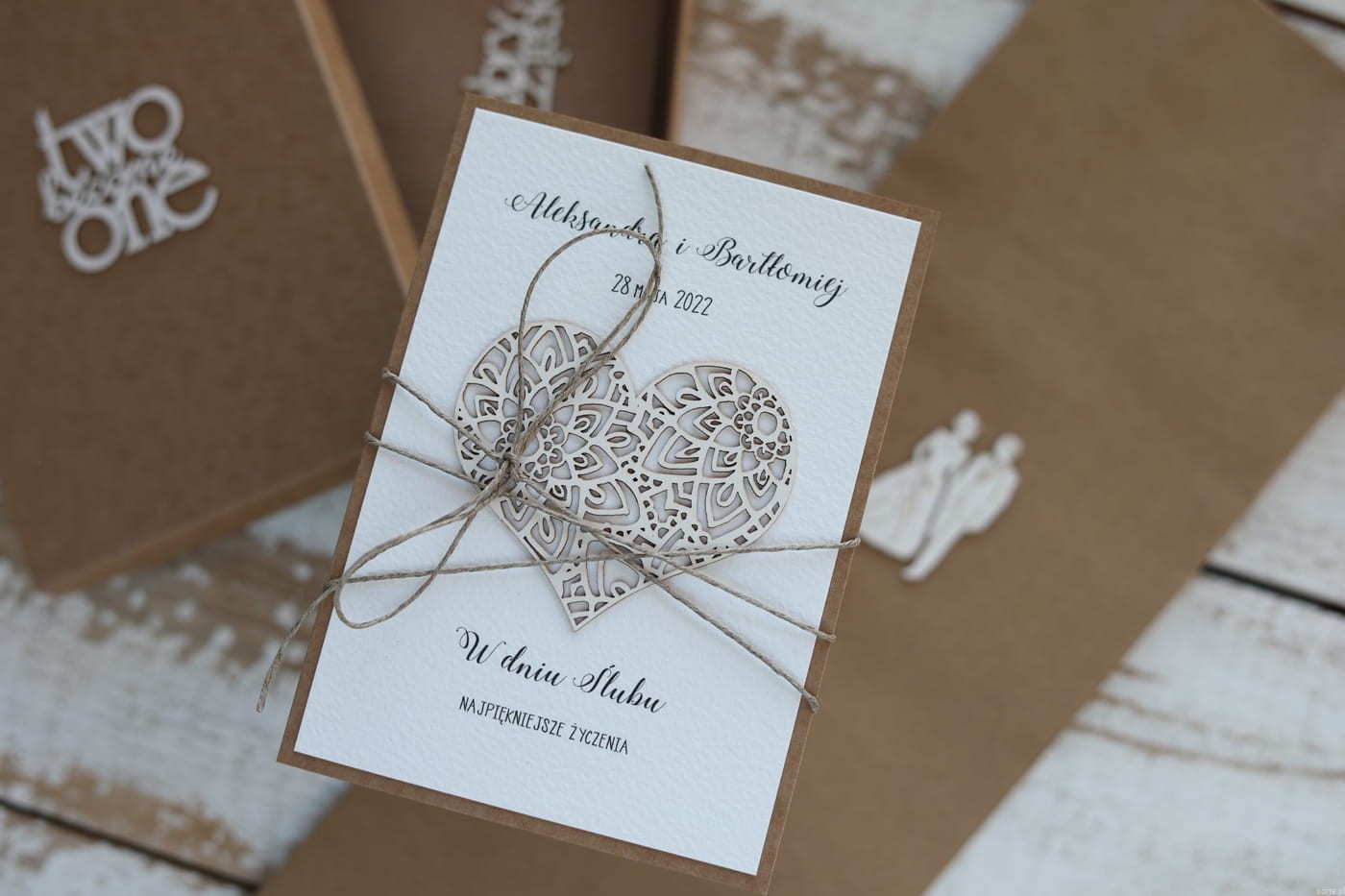 Rustykalna kartka ślubna ręcznie robiona z personalizacją 2 become 1.