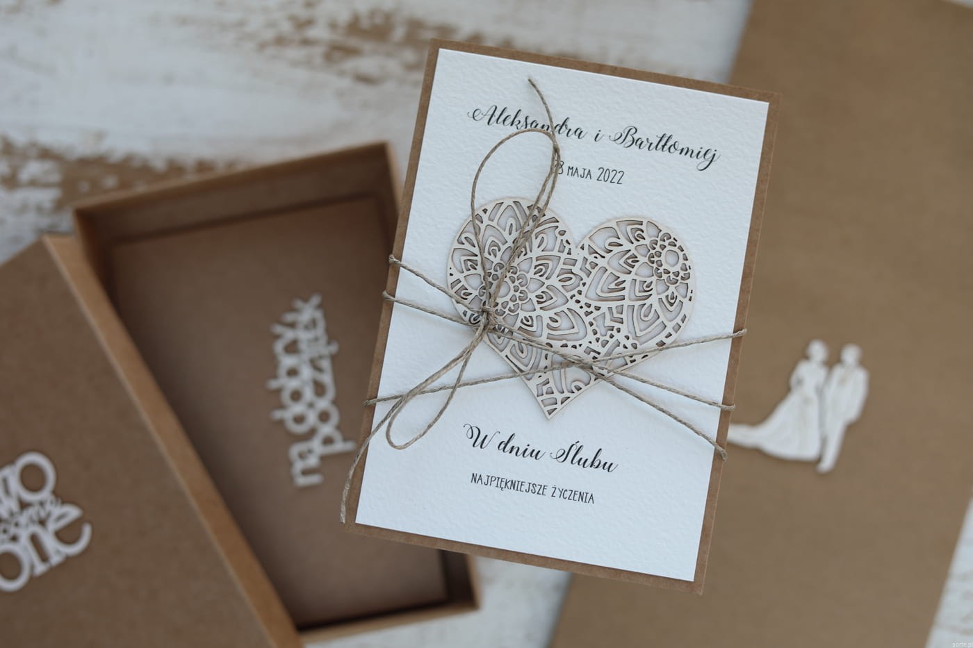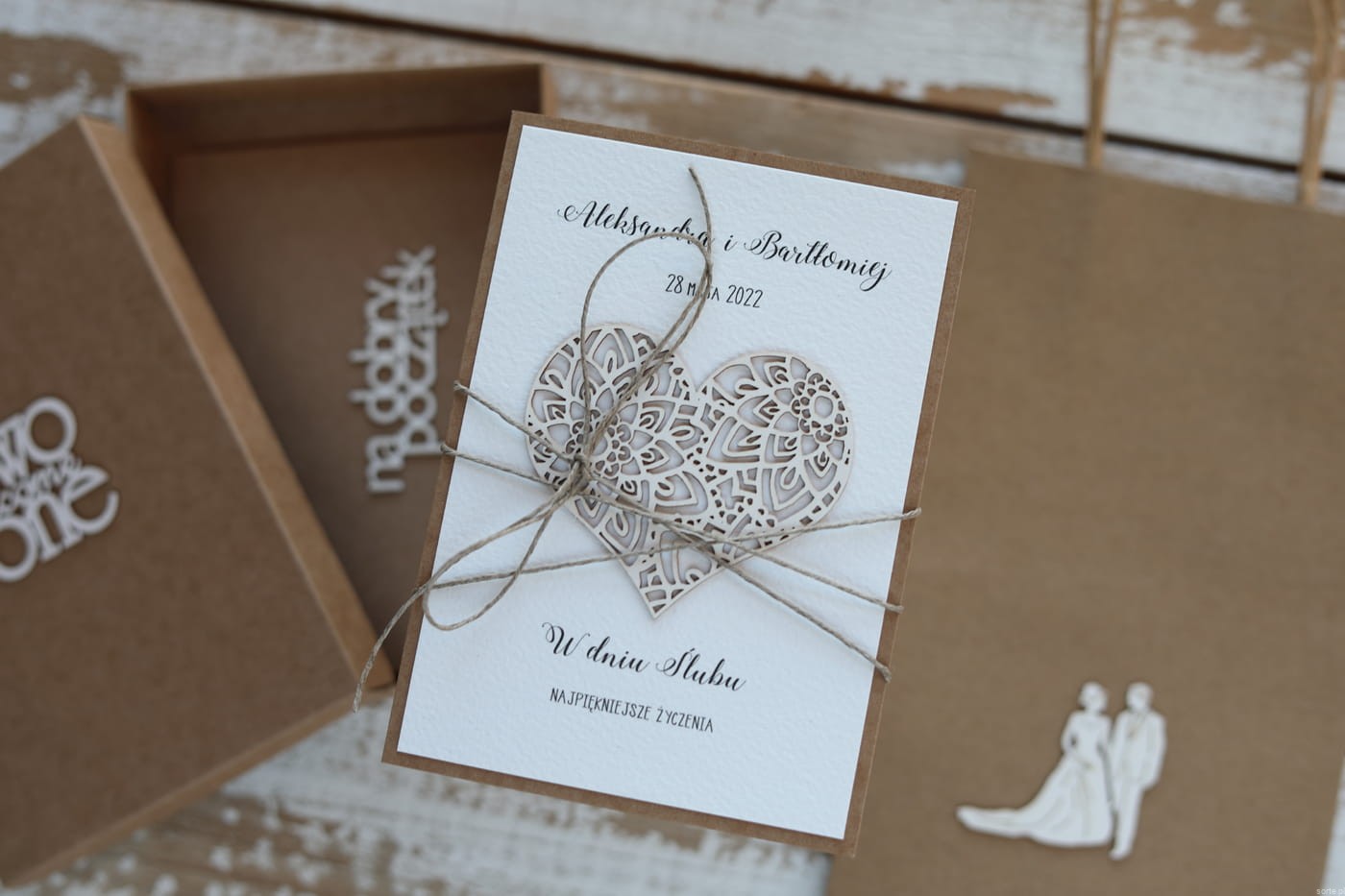 Kartka ślubna oraz pudełko przewiązane są lnianym sznureczkiem.