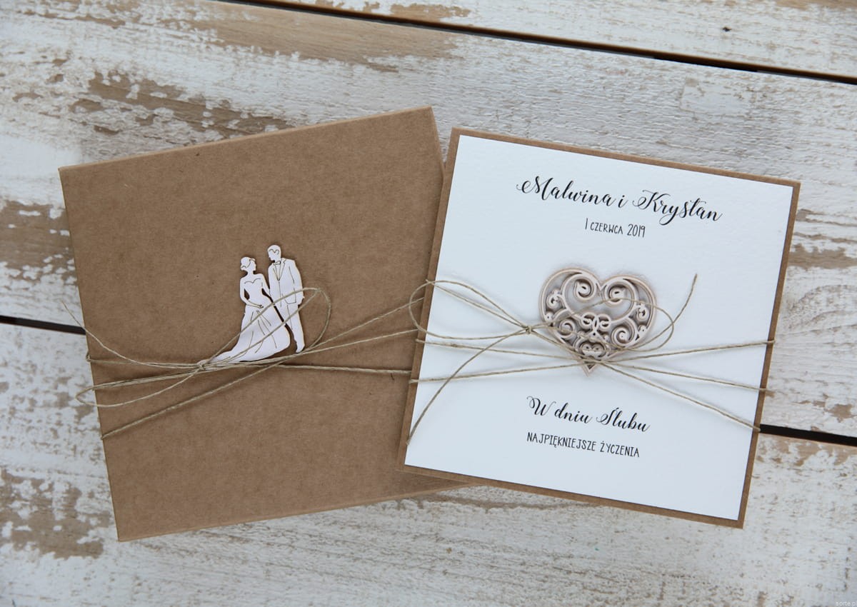 Rustykalna kartka ślubna z personalizacją panna młoda z trenem