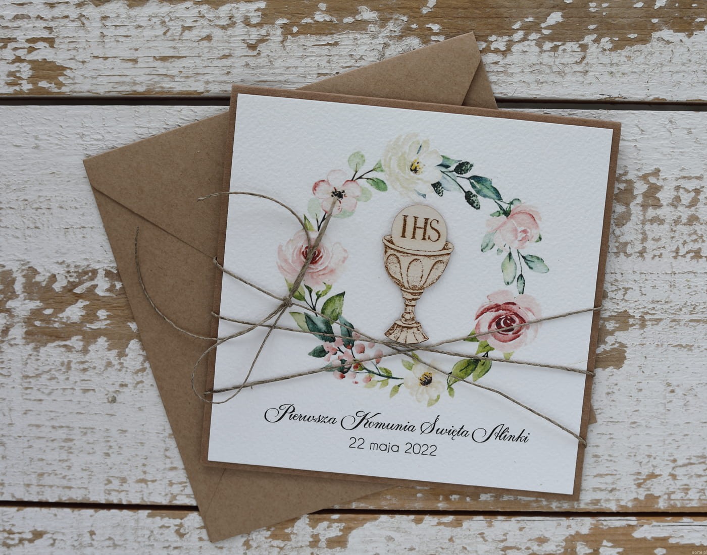 Rustykalna kartka na komunię handmade wykonana na bazie papieru kraftowego z użyciem starannie wyselekcjonowanego papieru bawełnianego w kolorze ecri oraz tekturkowej ozdoby. Kartka otwierana jest do góry. Przewiązana jest lnianym sznureczkiem. W zestawie brązowa koperta.