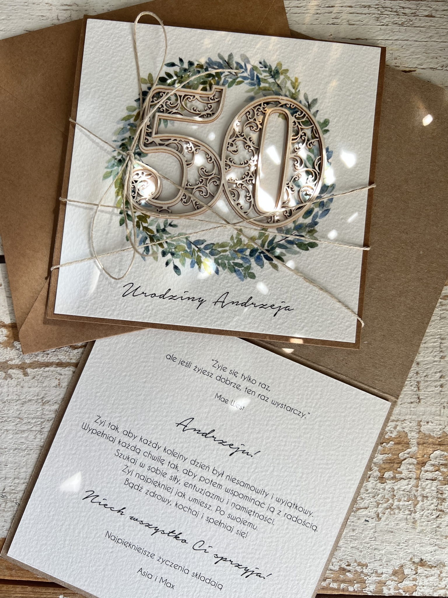 Wyjątkowa kartka ręcznie robiona na 50 urodziny prezent na pięćdziesiątkę z personalizacją najpiękniejsze życzenia urodzinowe