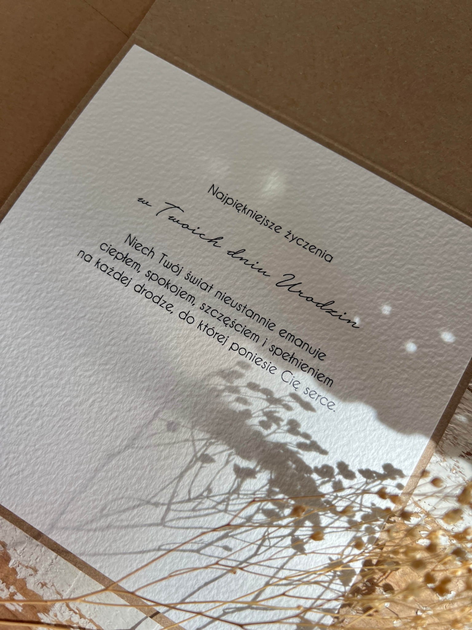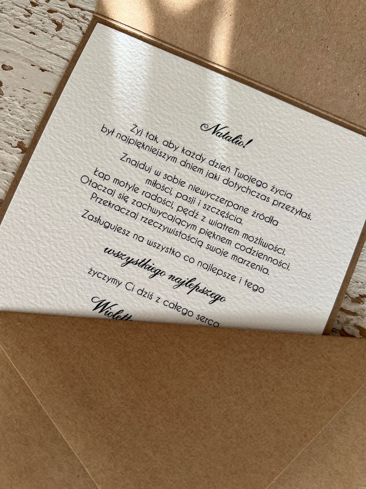 Kartka wykonana jest z najwyższej jakości starannie dobranych materiałów i dodatków w tym papieru kraftowego, ekologicznego papieru bawełnianego - 100% bawełny w odcieniu śmietanki, tekturkowych ozdób. Personalizowana na przodzie w postaci imienia - daty (możesz podać własny tekst na przód kartki oraz do środka). Mile widziane słowa prosto z serca :)