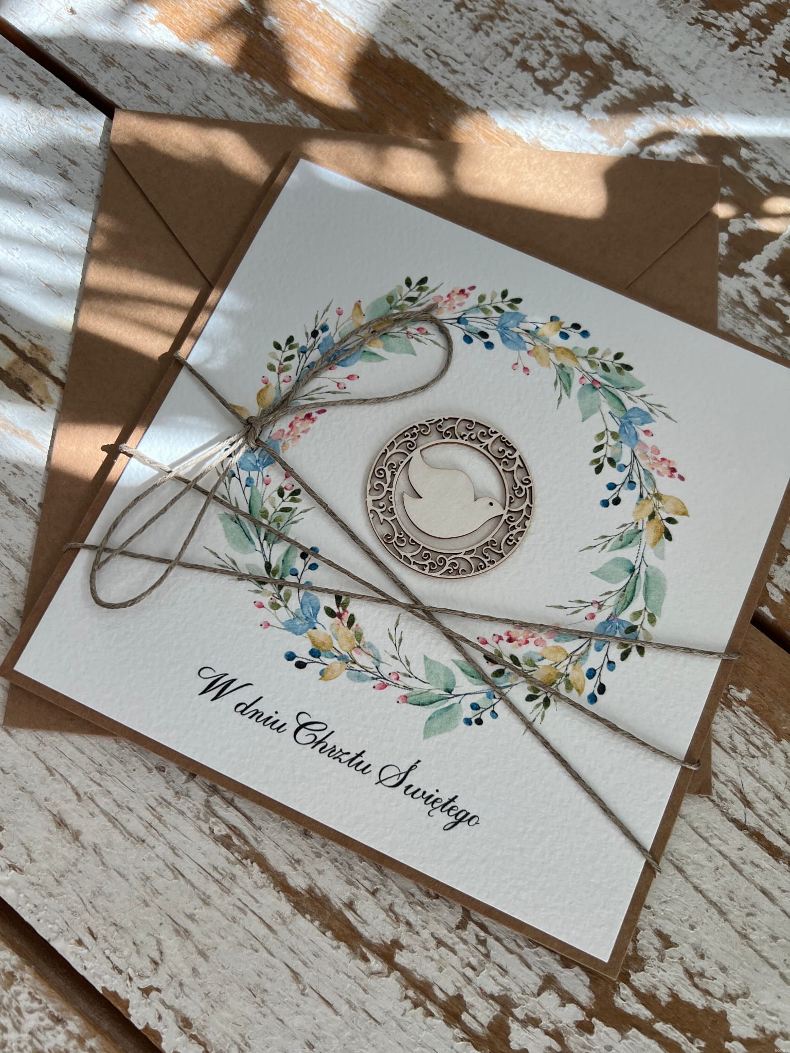 Kartka na chrzest o wymiarach 14x14 cm wykonana jest z papieru kraftowego oraz papieru bawełnianego w kolorze śmietanki z użyciem ozdoby tekturkowej. Kartka otwierana do góry, w środku wklejona jest kartka z papieru bawełnianego z gotowymi życzeniami (brak możliwości zmiany). W zestawie z kopertą.