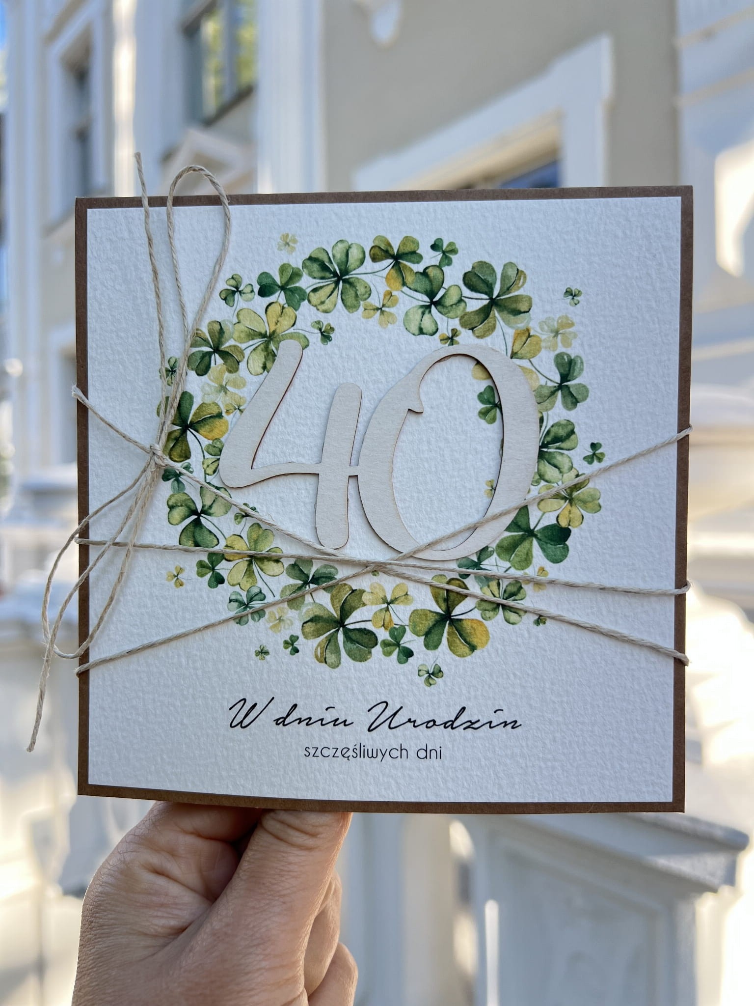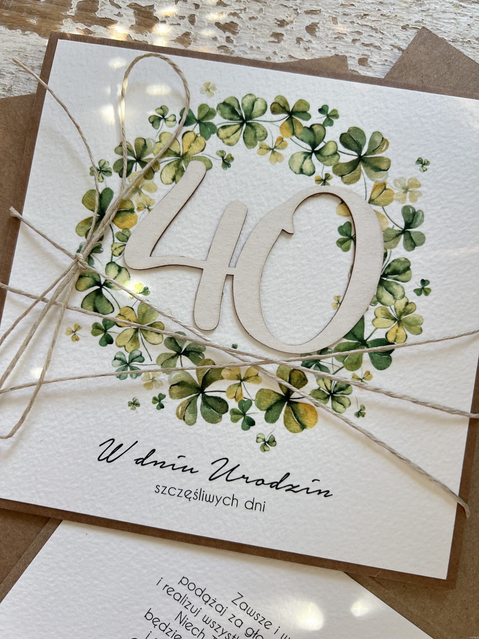 Wyjątkowa kartka ręcznie robiona na czterdziestkę, pomysł na prezent na 40 prezent - czterolistna koniczynka