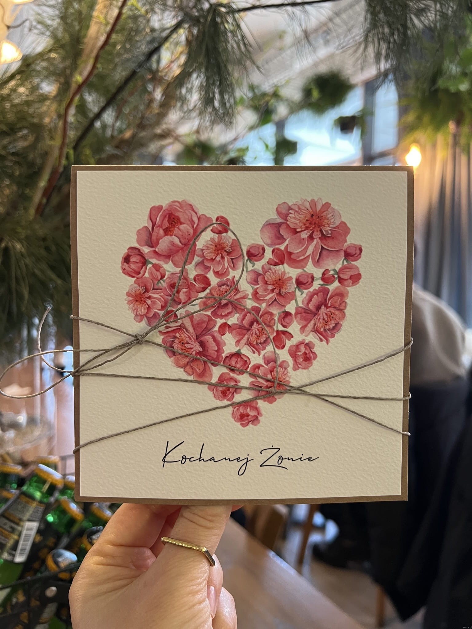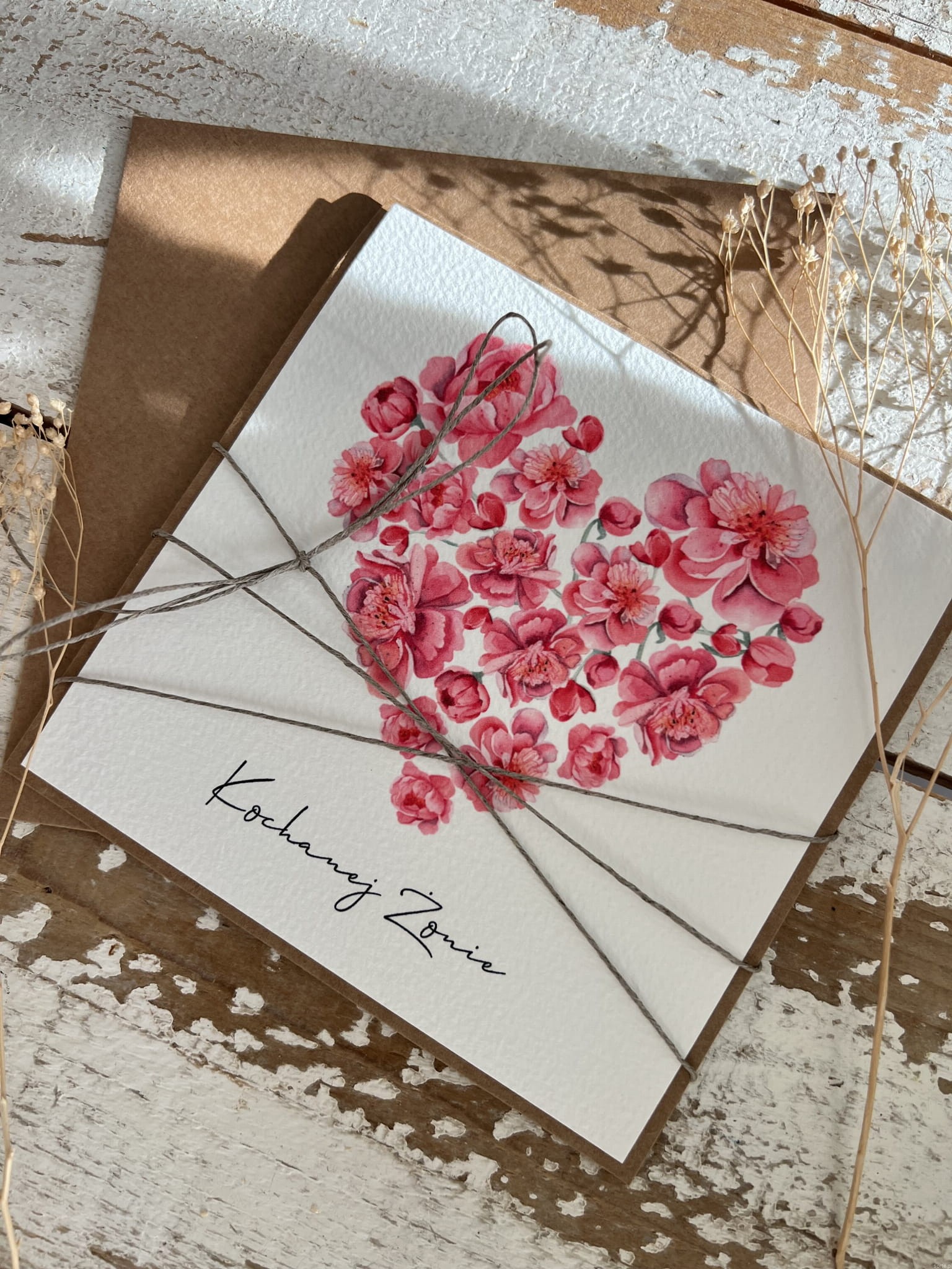 Wymiary: kartka 14x14cm otwierana do góry, przewiązana lnianym sznureczkiem w zestawie z brązową kopertą.