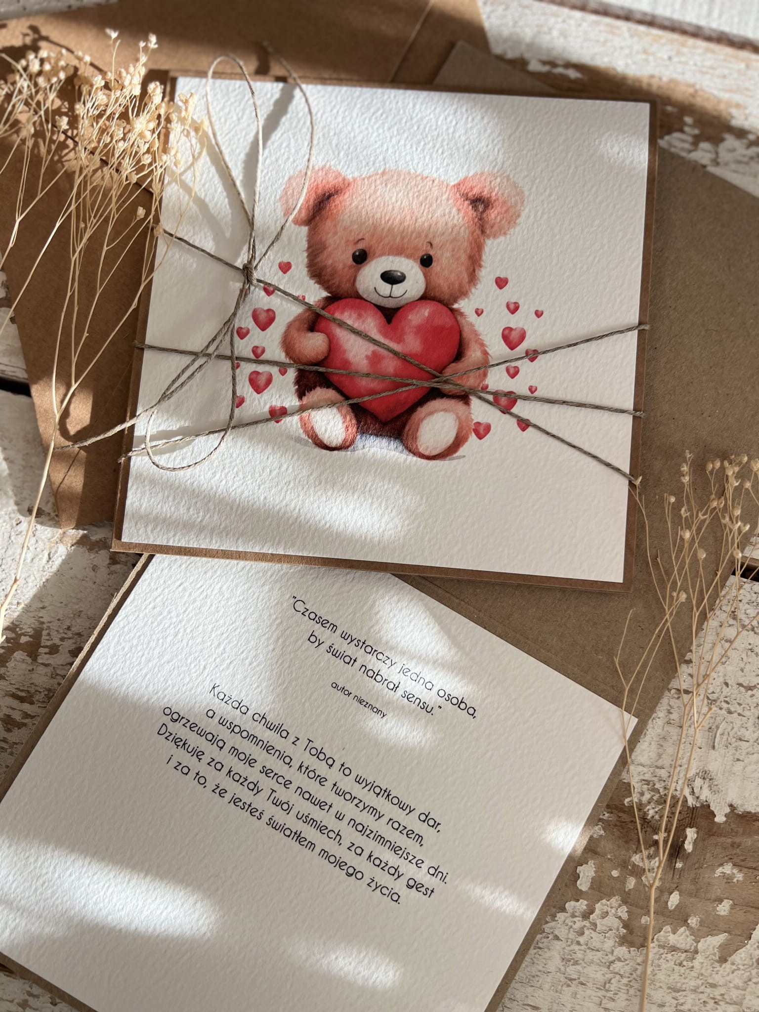 Wymiar kartki 14x14 cm w zestawie z brązową kopertą. Kartka przewiązana lnianym sznureczkiem.