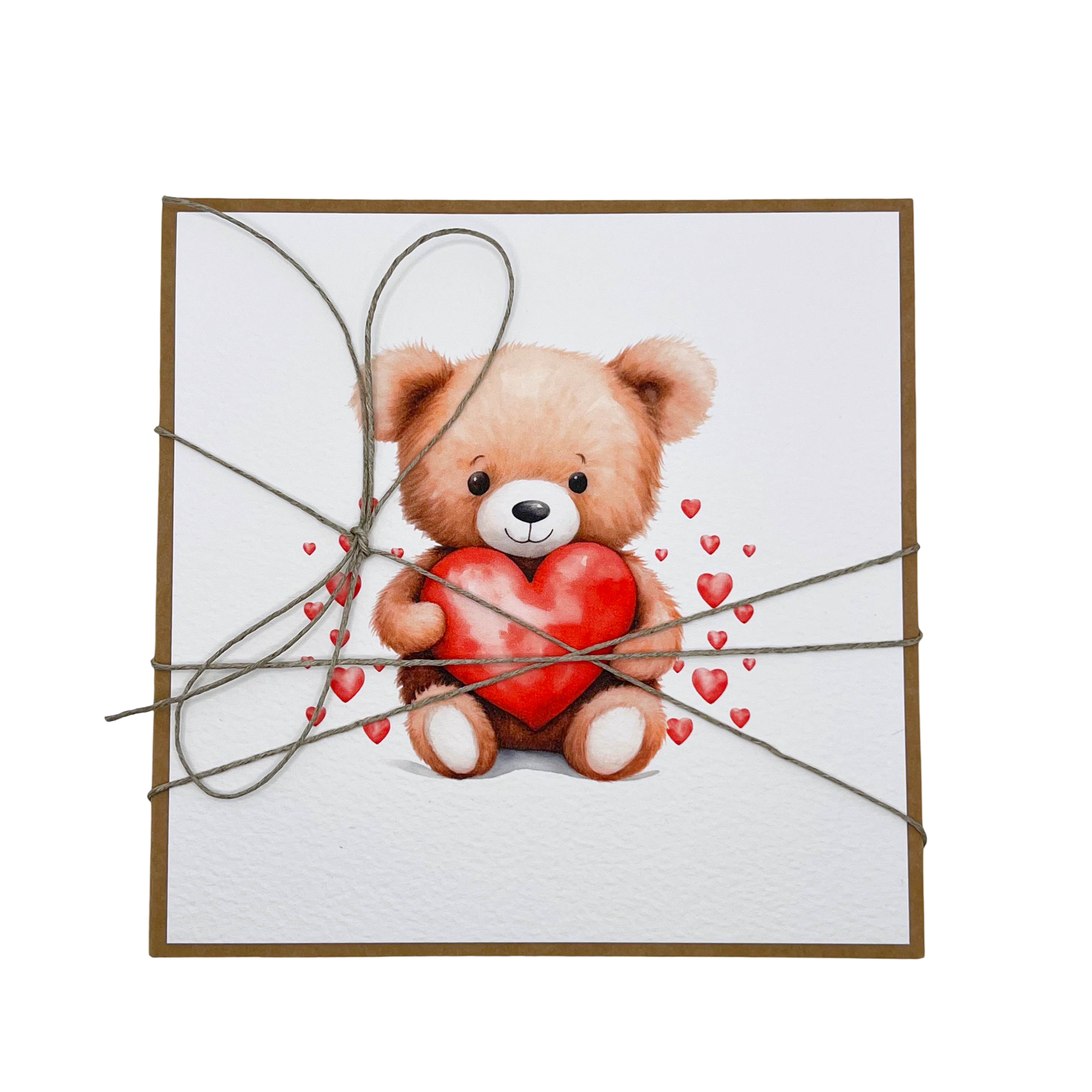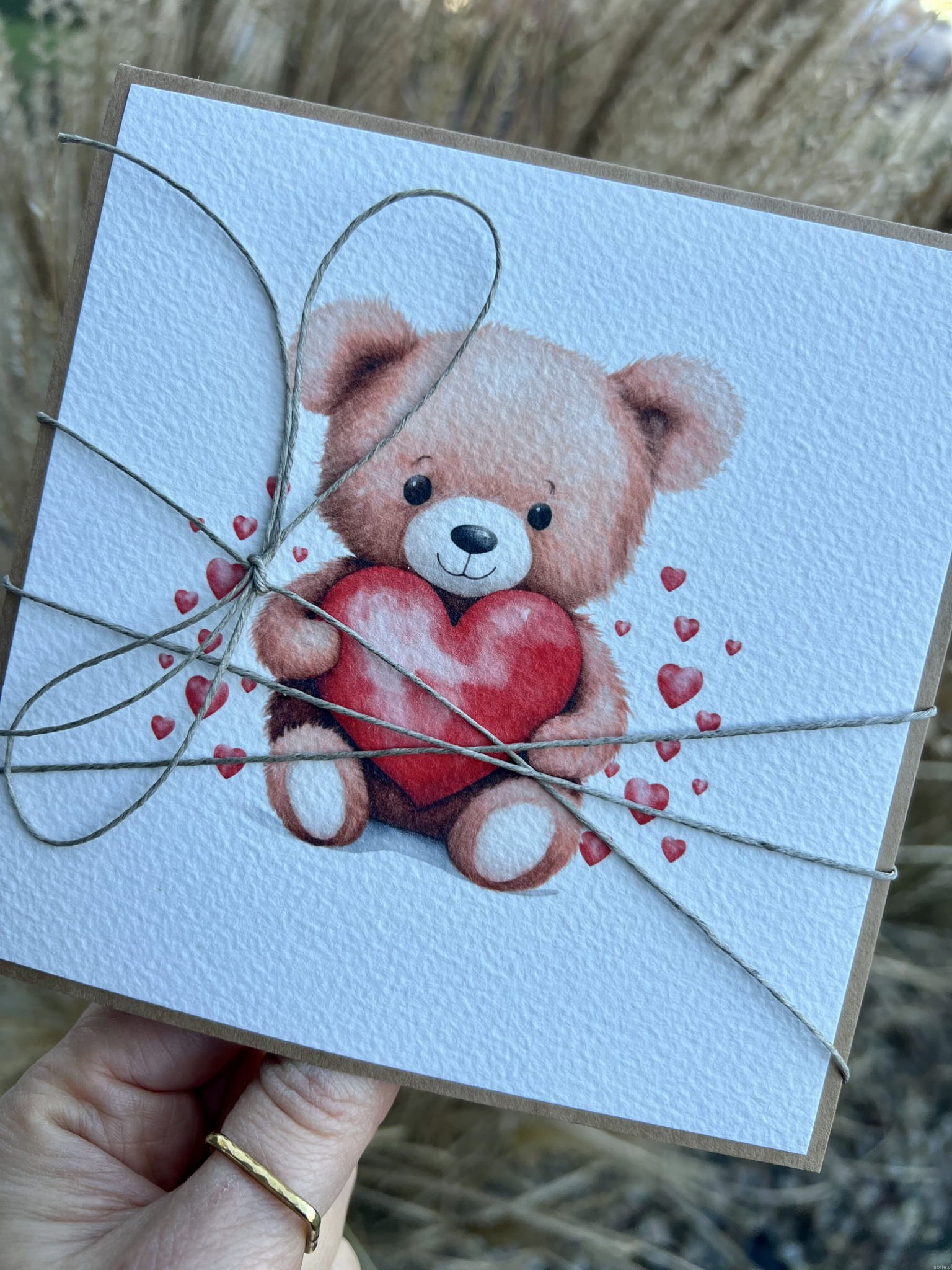 Wyjątkowa ręcznie robiona kartka prezent na walentynki, walentynkowa - walentynka z misiem z sercem - miś z sercem